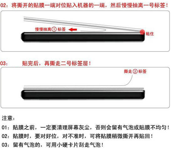 - Сначала обнародоните этикетку 1 слой защитного слоя, выровняйте сторону экрана сбоку, а затем используйте ткань с утиркой, не стержней, к плоскому пузырьку, чтобы мембрана полностью прикреплена к поверхности экрана.