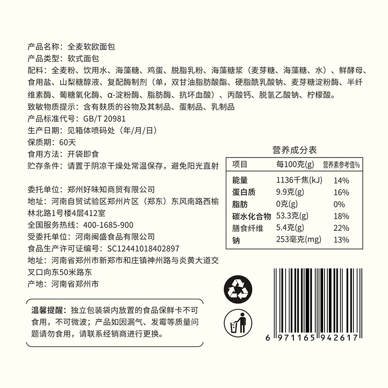 На языке 0 жирная цельная пшеничная сумка хлеб 800 г/коробка завтрак сэндвич.