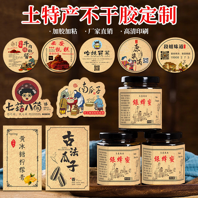 Этикетки и наклейки из крафт-бумаги, стеклянные бутылки и банки по индивидуальному заказу, сувениры, сушеные рисовые лепешки из сладкого картофеля ручной работы, торговые марки соуса чили, персонализированный мед, соленья, бекон, колбасы, копченые изделия из утки, самоклеящаяся офсетная печать.