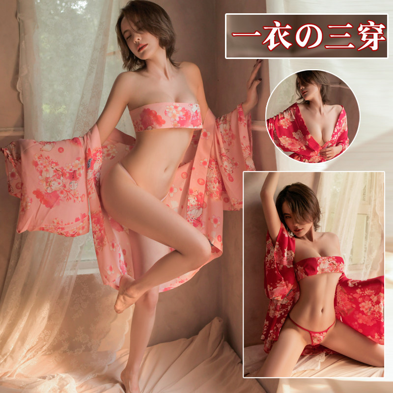 Красный ремень, сексуальная пижама, шифоновый комплект, японское нижнее белье, кимоно, униформа, 3 предмета
