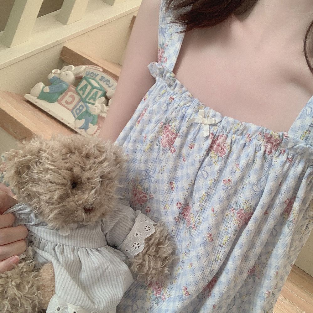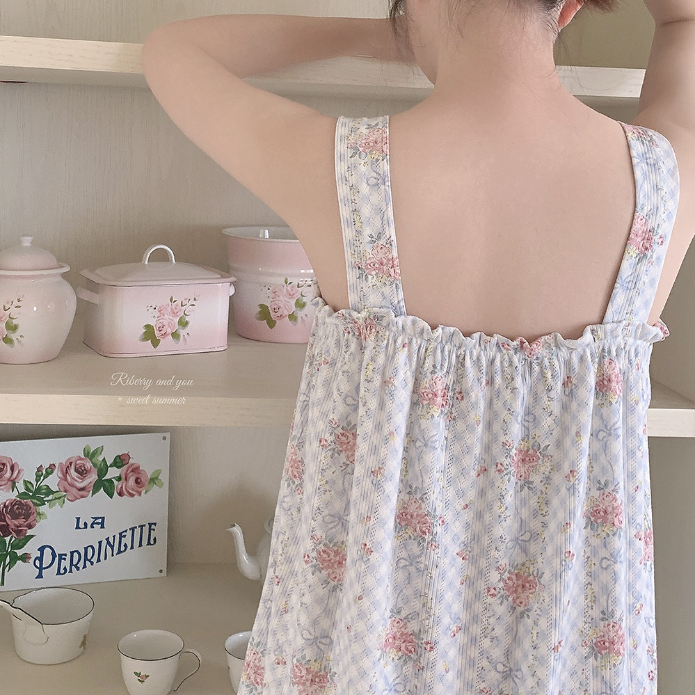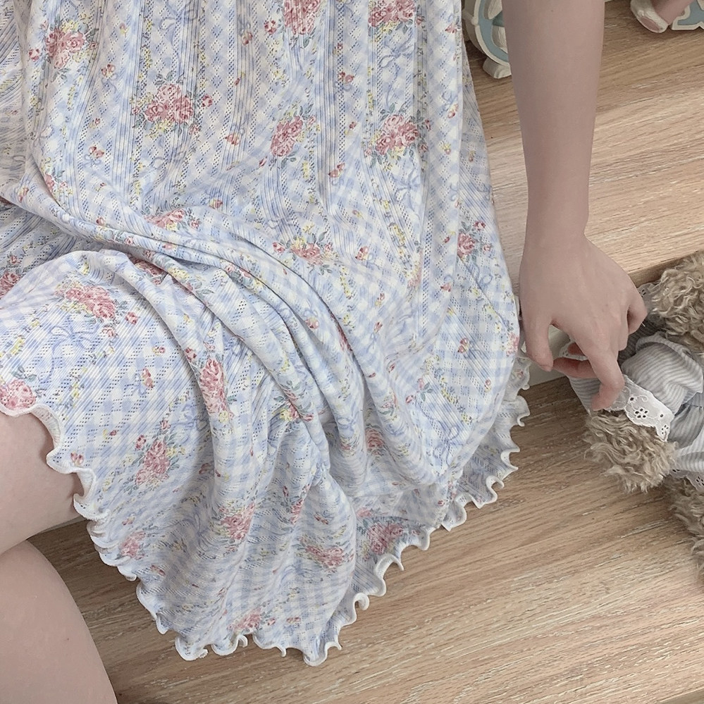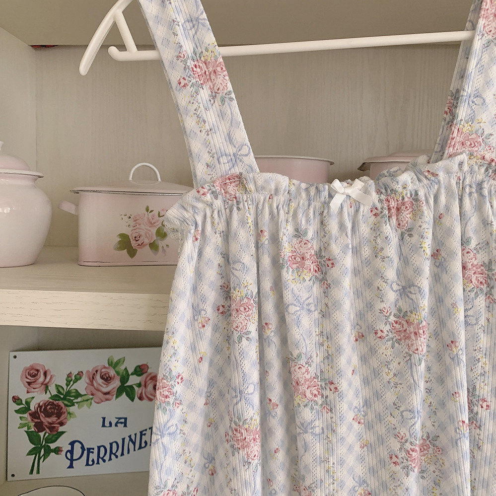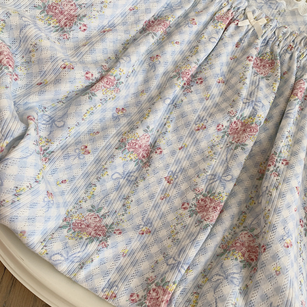 Ретро французская девушка синяя клетчатая роза маленькая цветочный дом пижама бумажная юбка пустое полное принт u