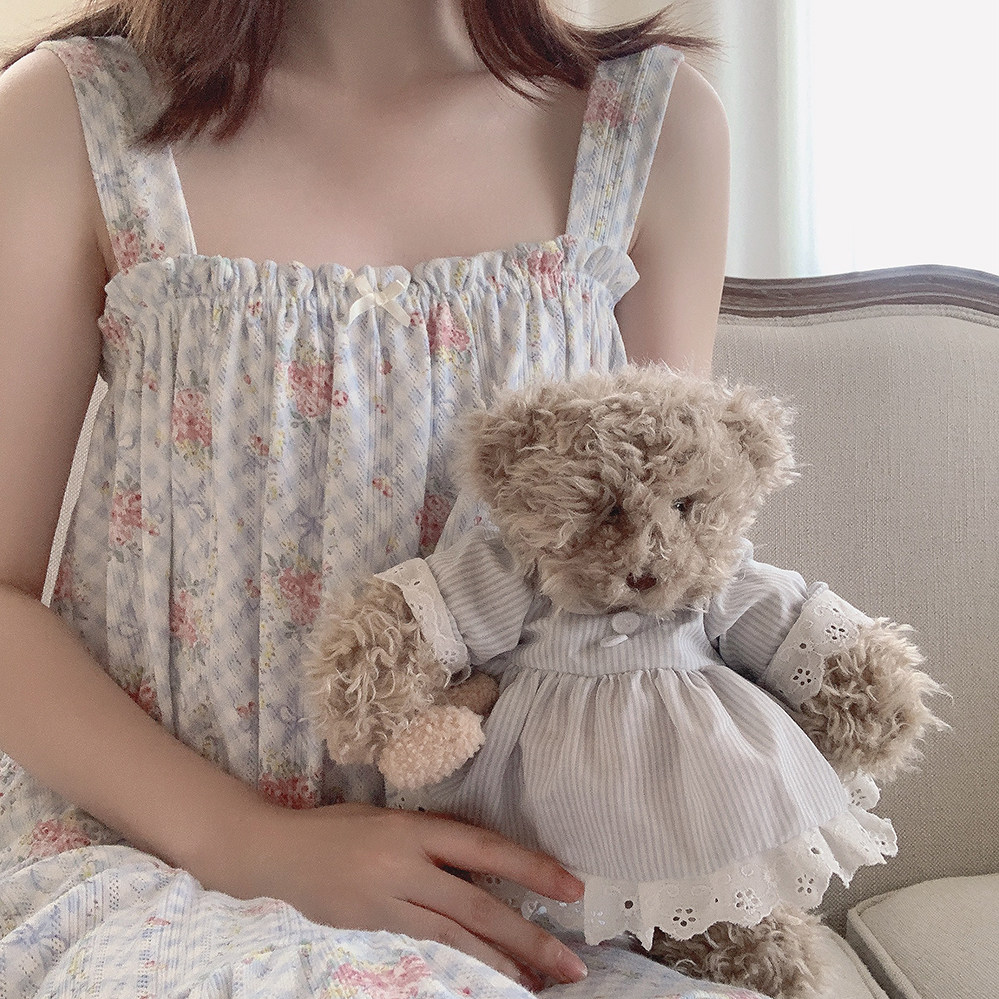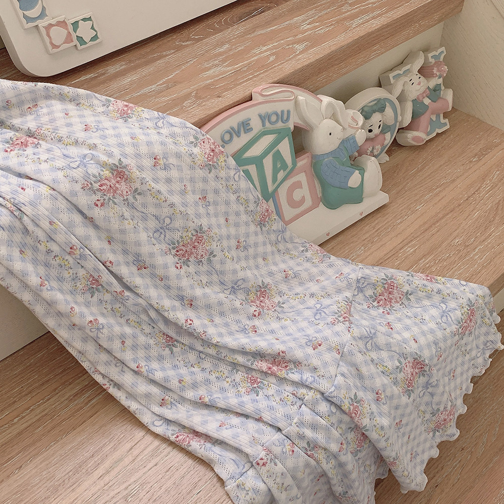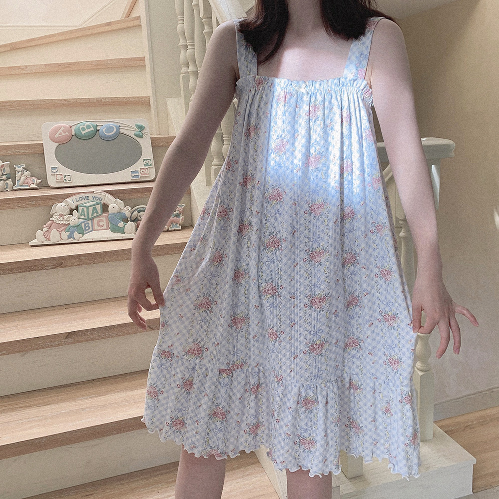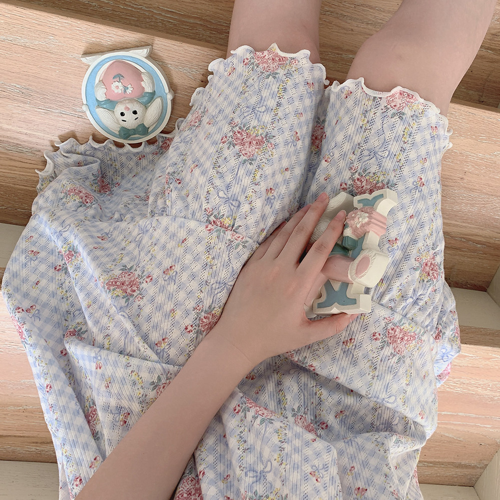 Ретро французская девушка синяя клетчатая роза маленькая цветочный дом пижама бумажная юбка пустое полное принт u