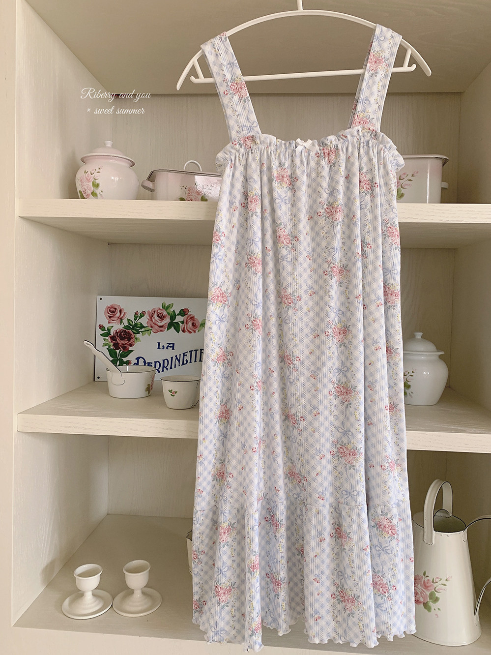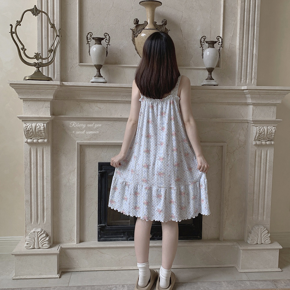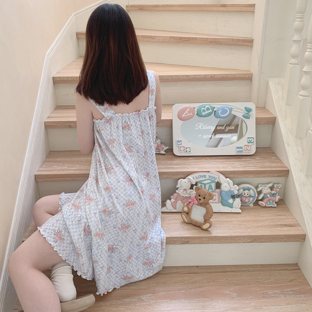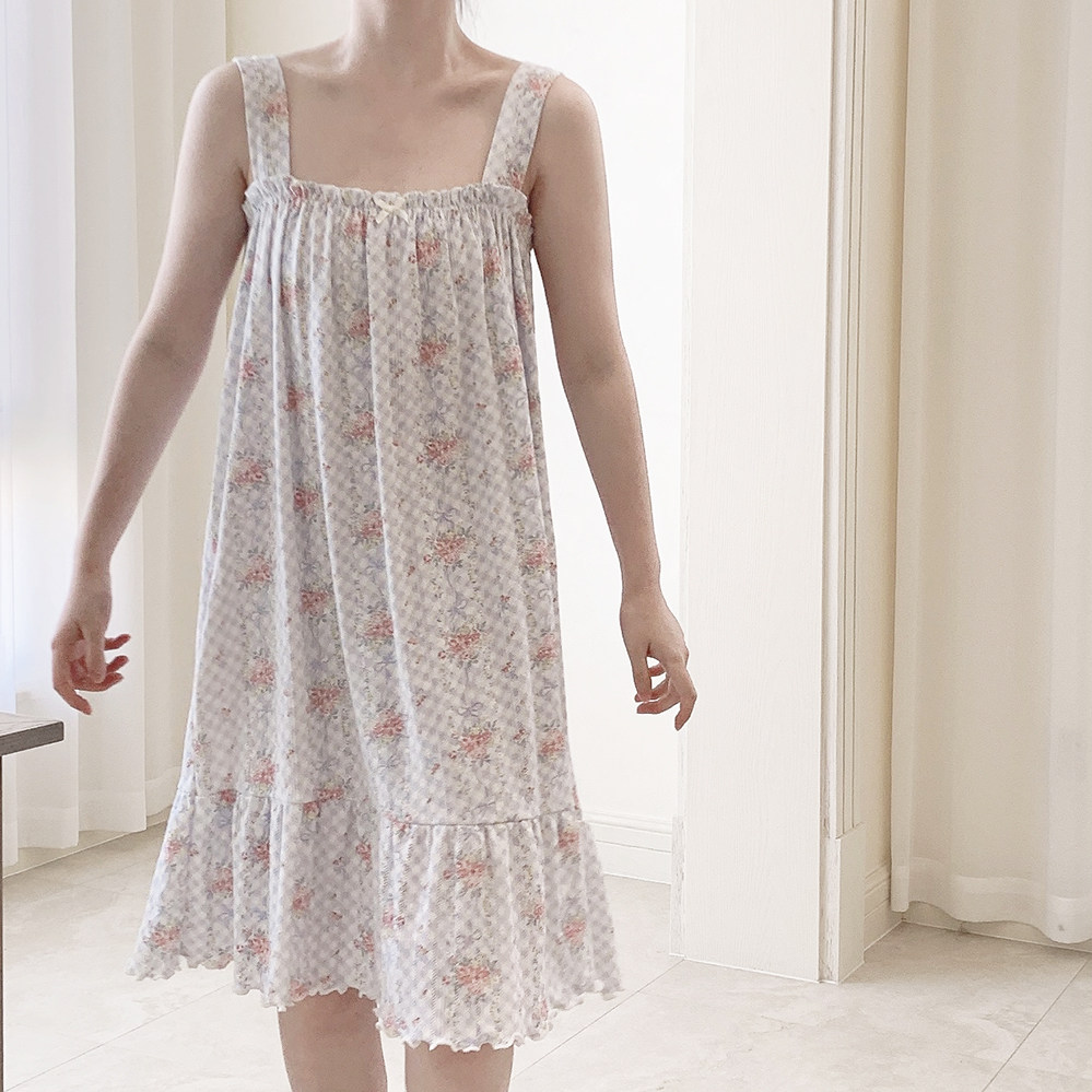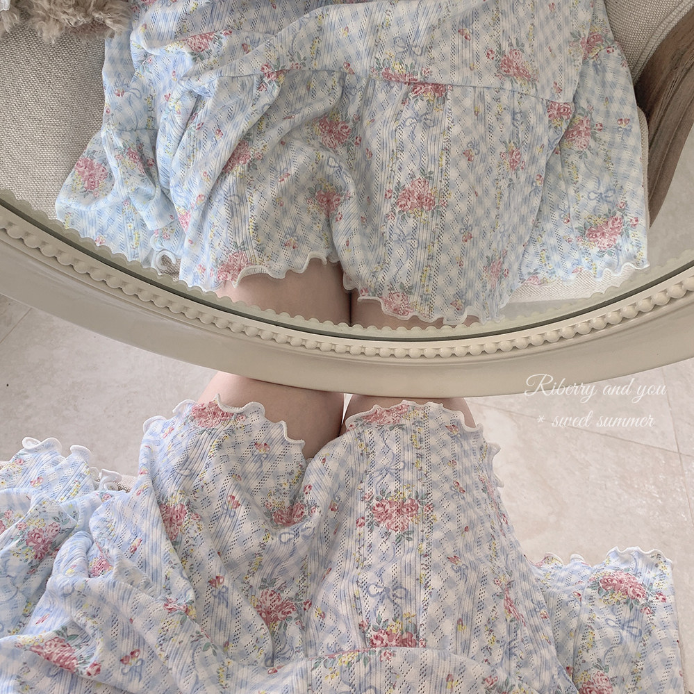 Ретро французская девушка синяя клетчатая роза маленькая цветочный дом пижама бумажная юбка пустое полное принт u
