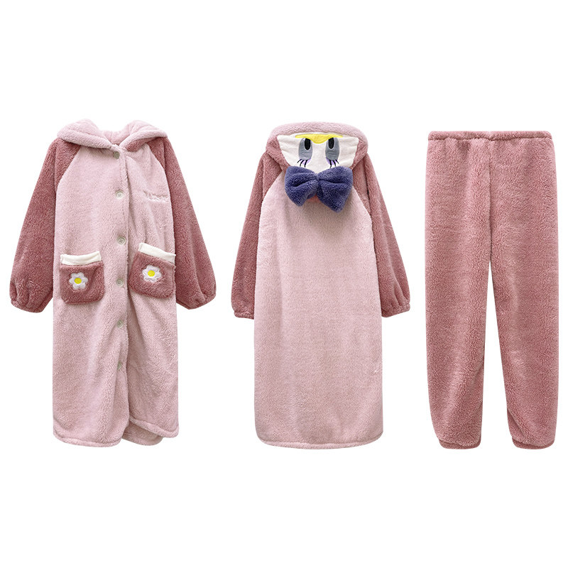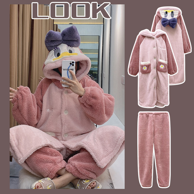 Дисней, розовая демисезонная коралловая бархатная пижама, мультяшный длинный банный халат, комплект, Дональд Дак, увеличенная толщина, средней длины