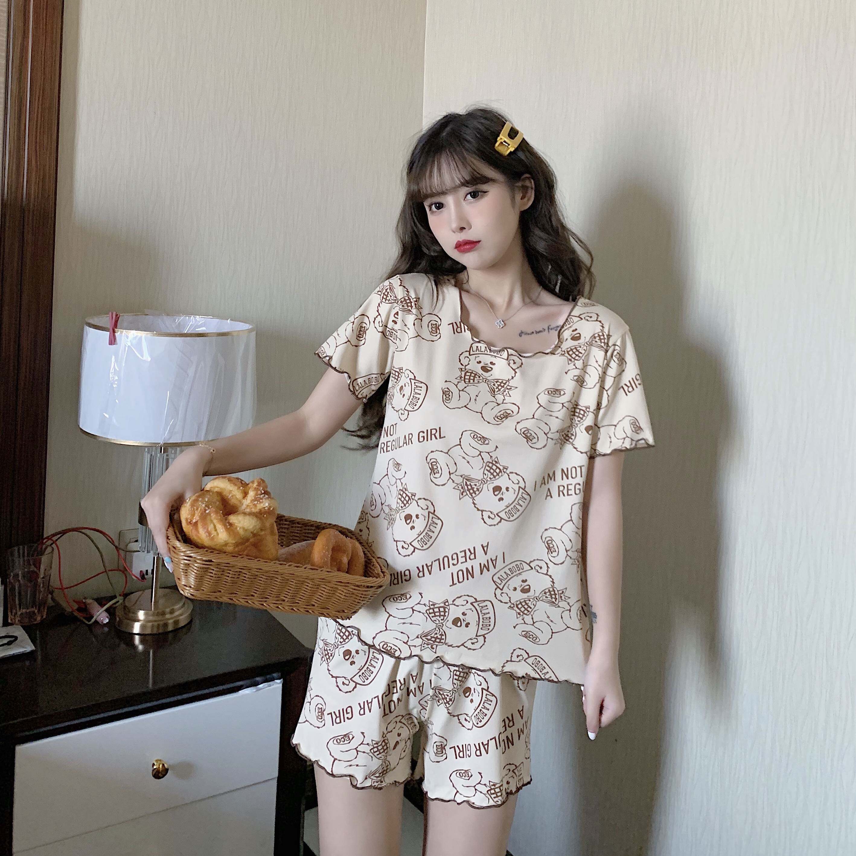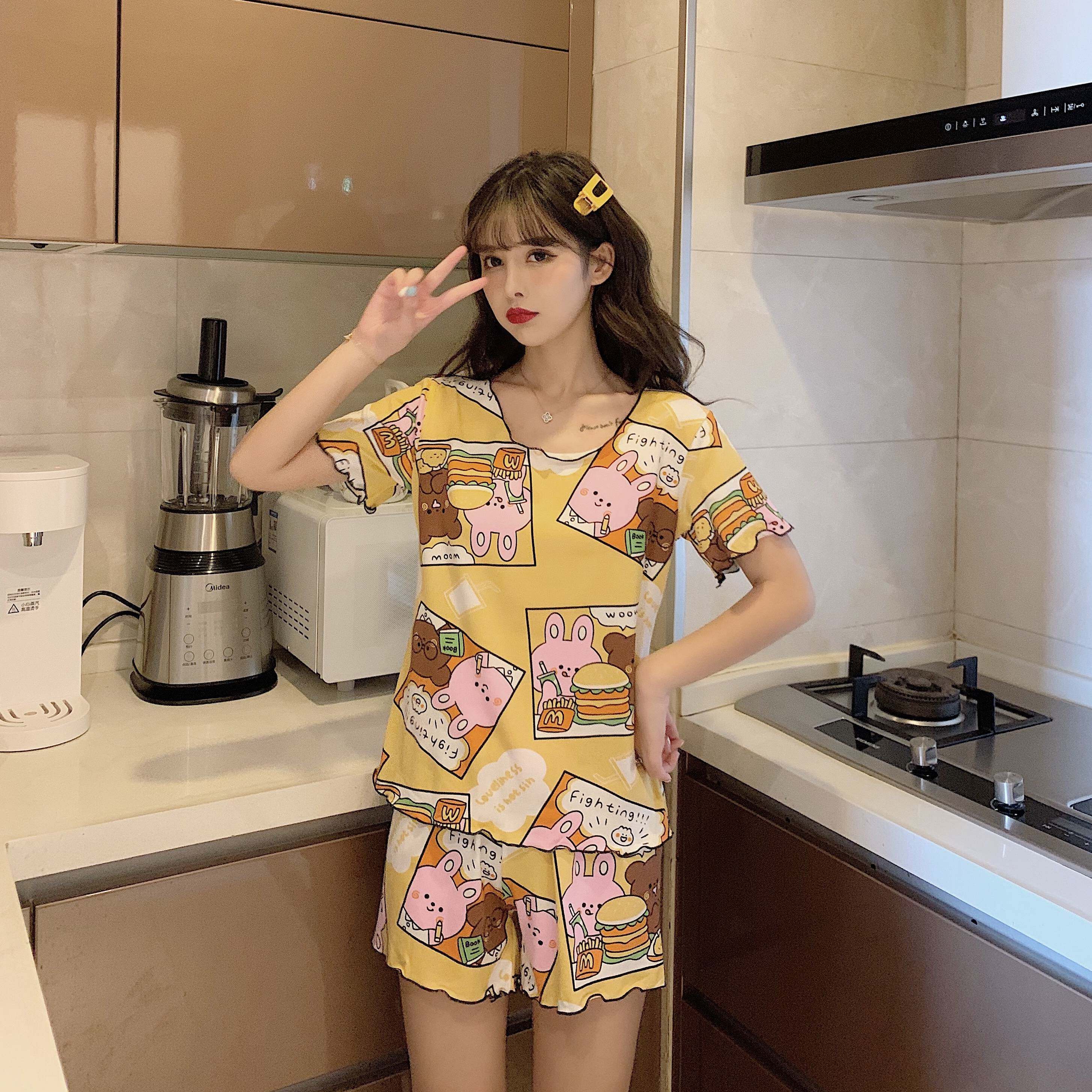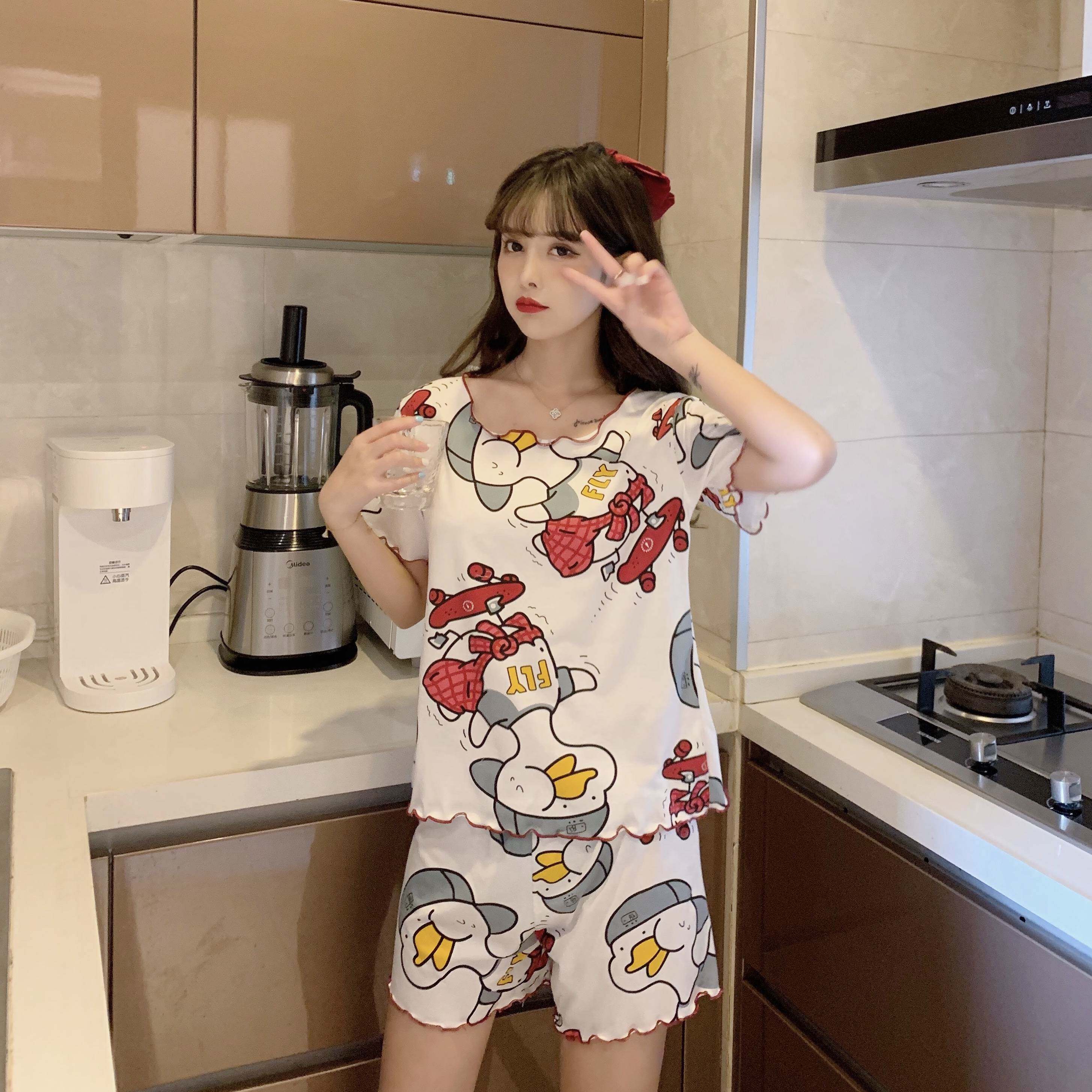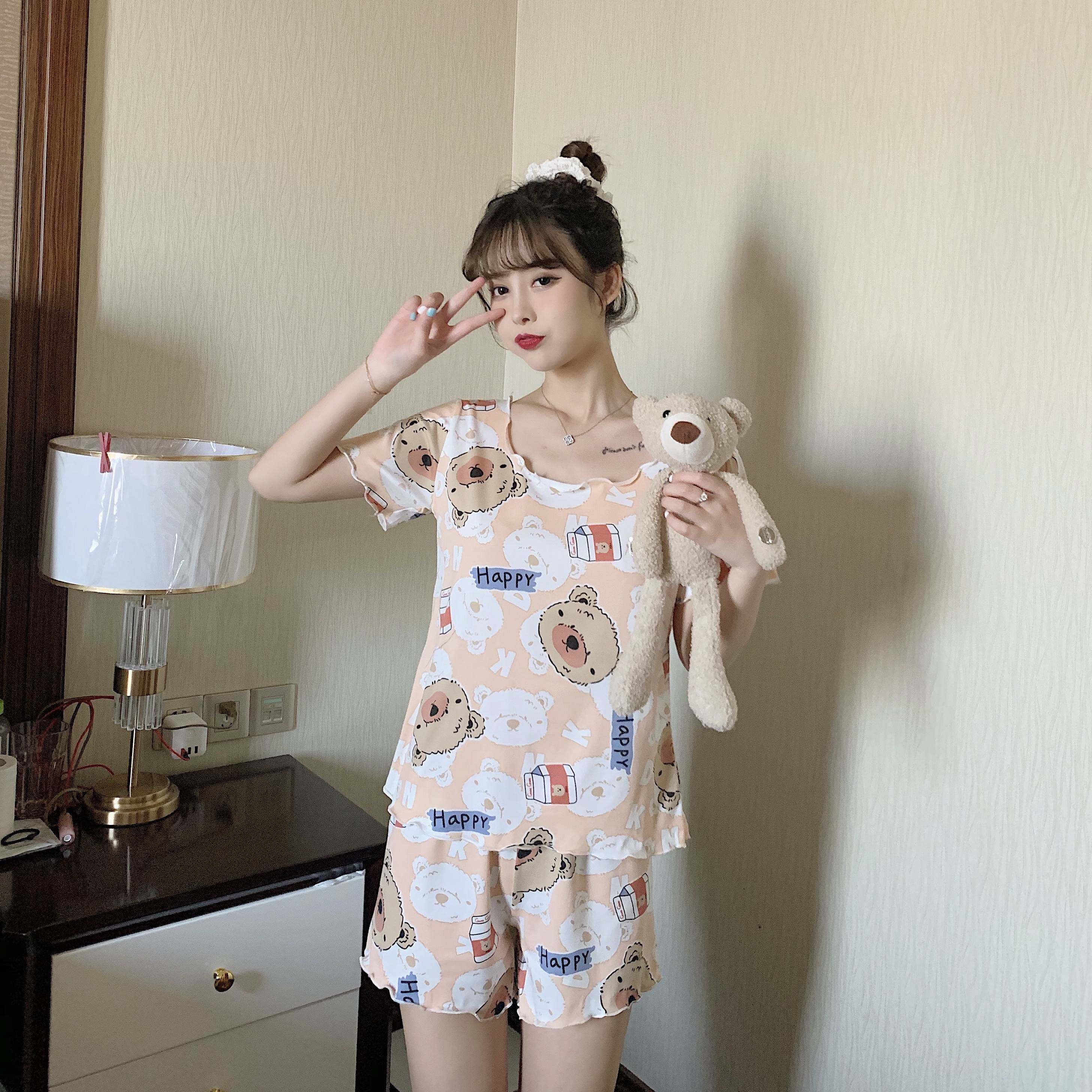 Летняя хлопковая милая пижама, милый тонкий комплект для отдыха, короткий рукав, в корейском стиле