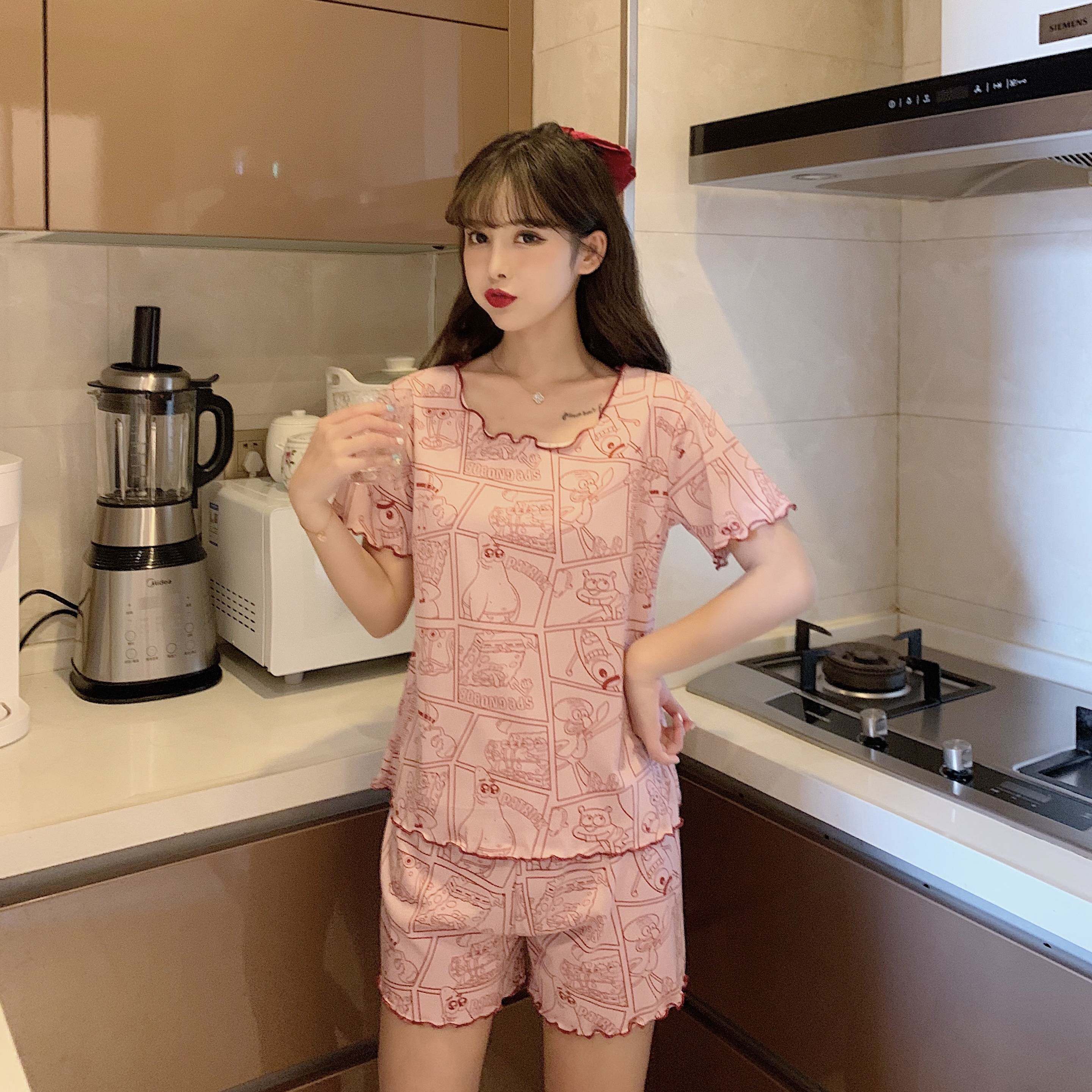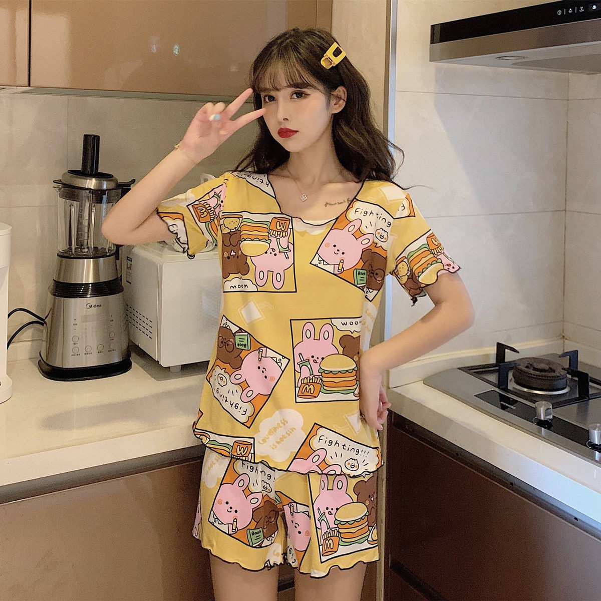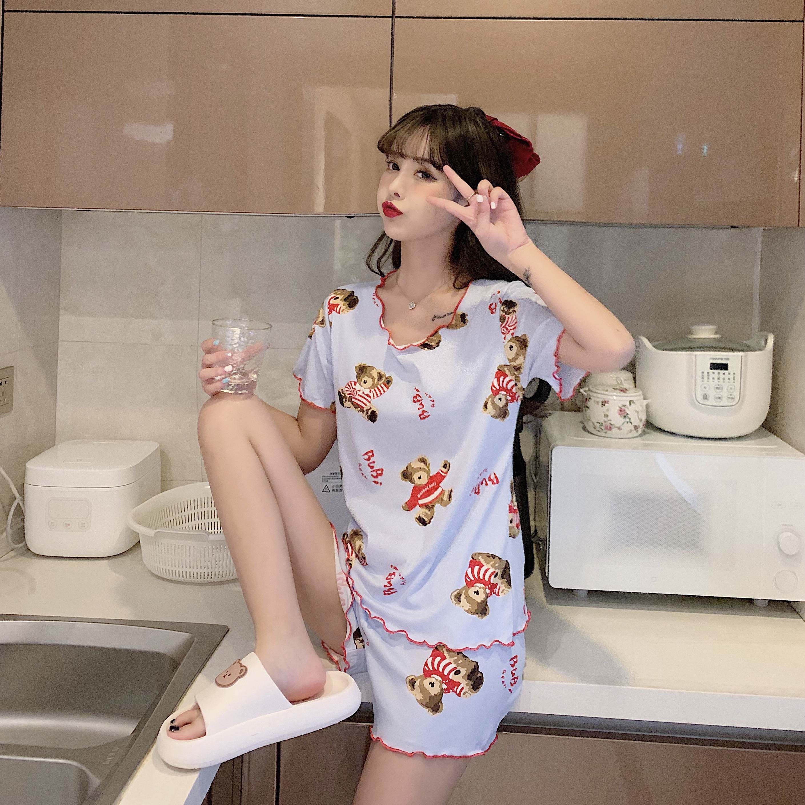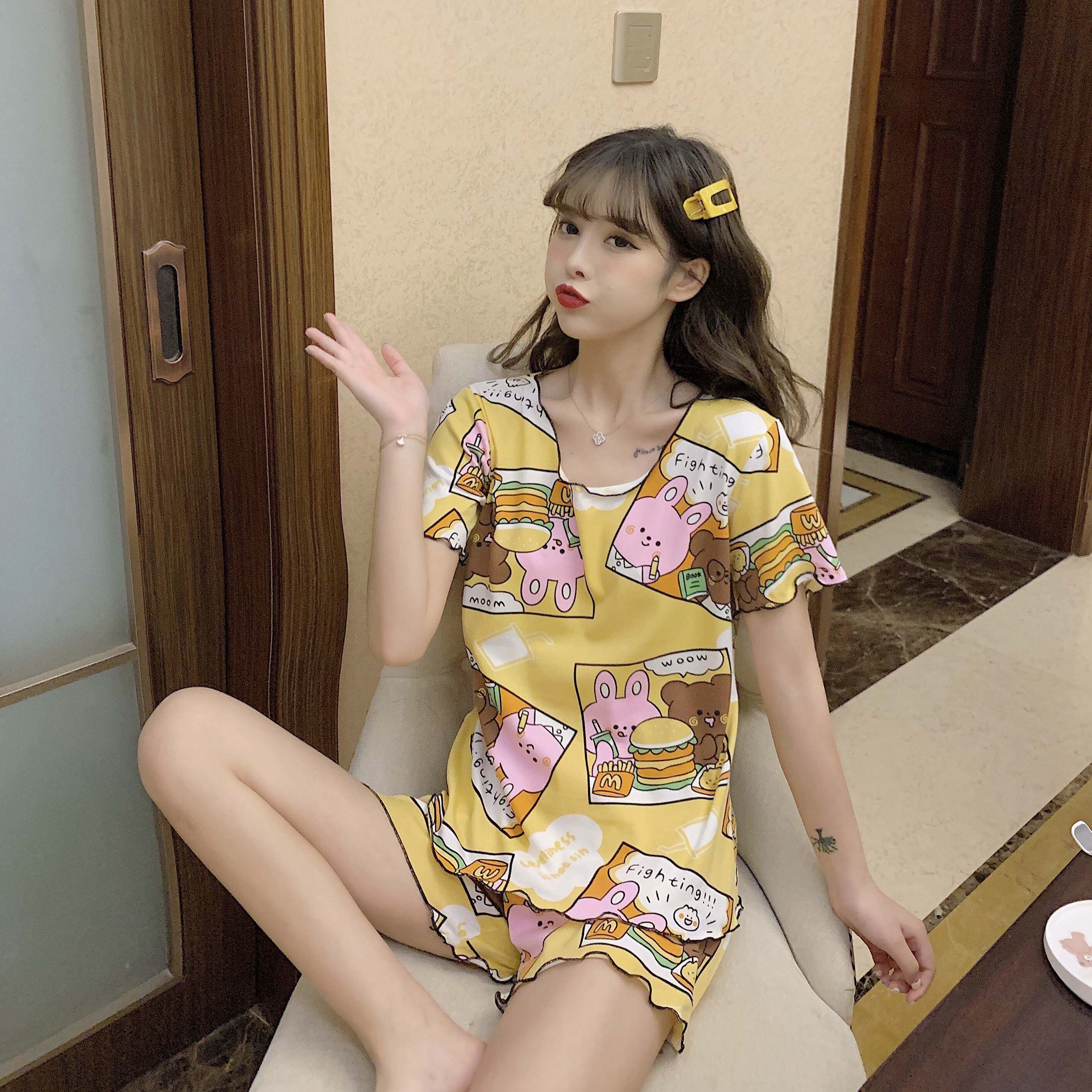 Летняя хлопковая милая пижама, милый тонкий комплект для отдыха, короткий рукав, в корейском стиле