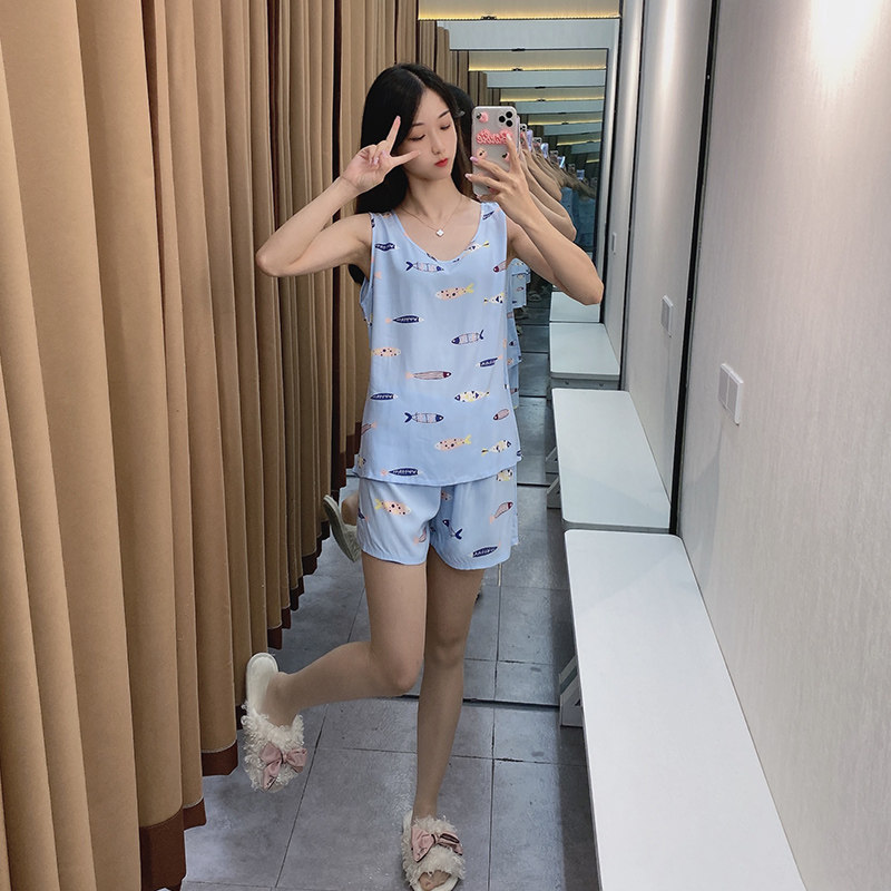 Летняя свежая пижама, тонкая майка без рукавов, шорты, комплект, цветочный принт, эффект подтяжки, 2021 года