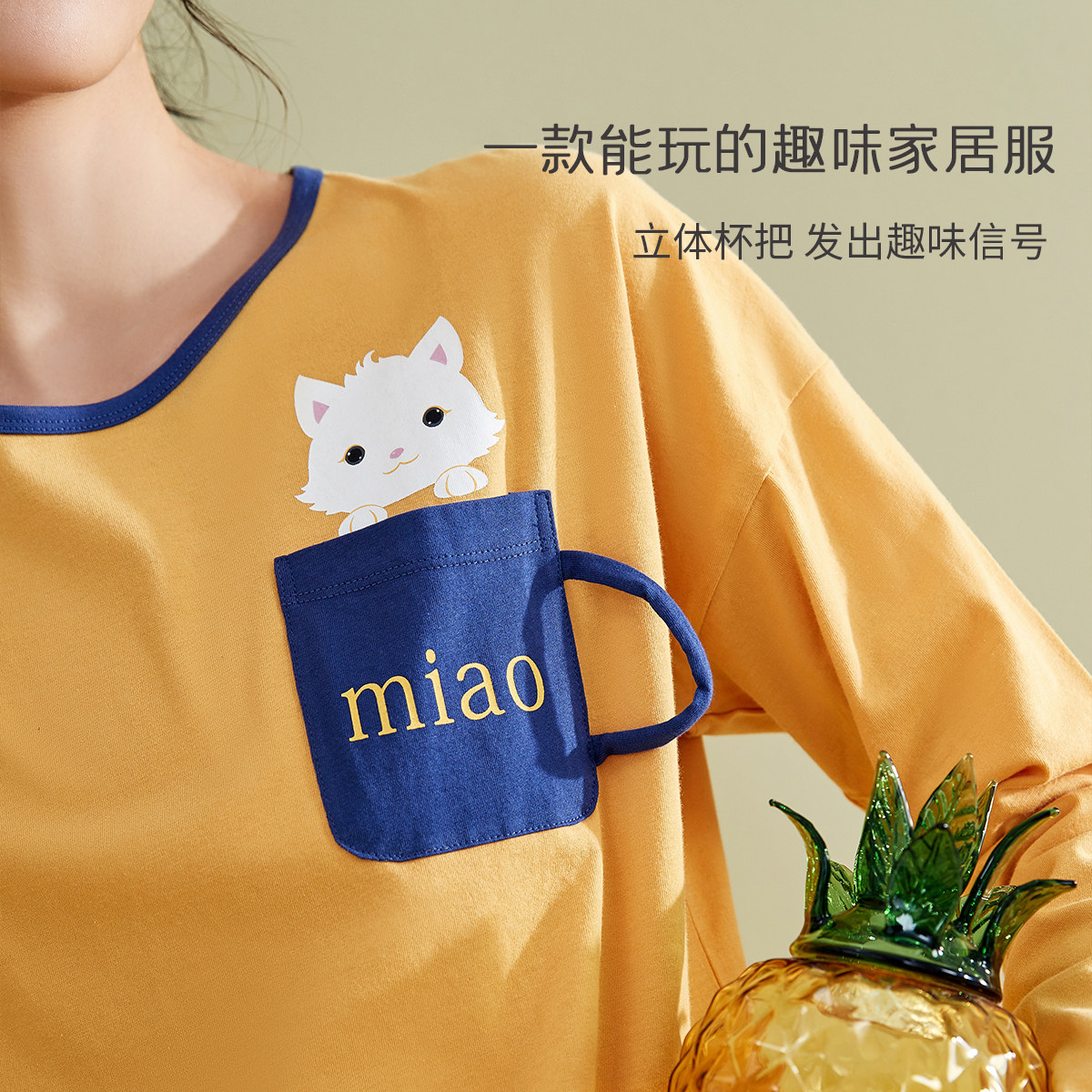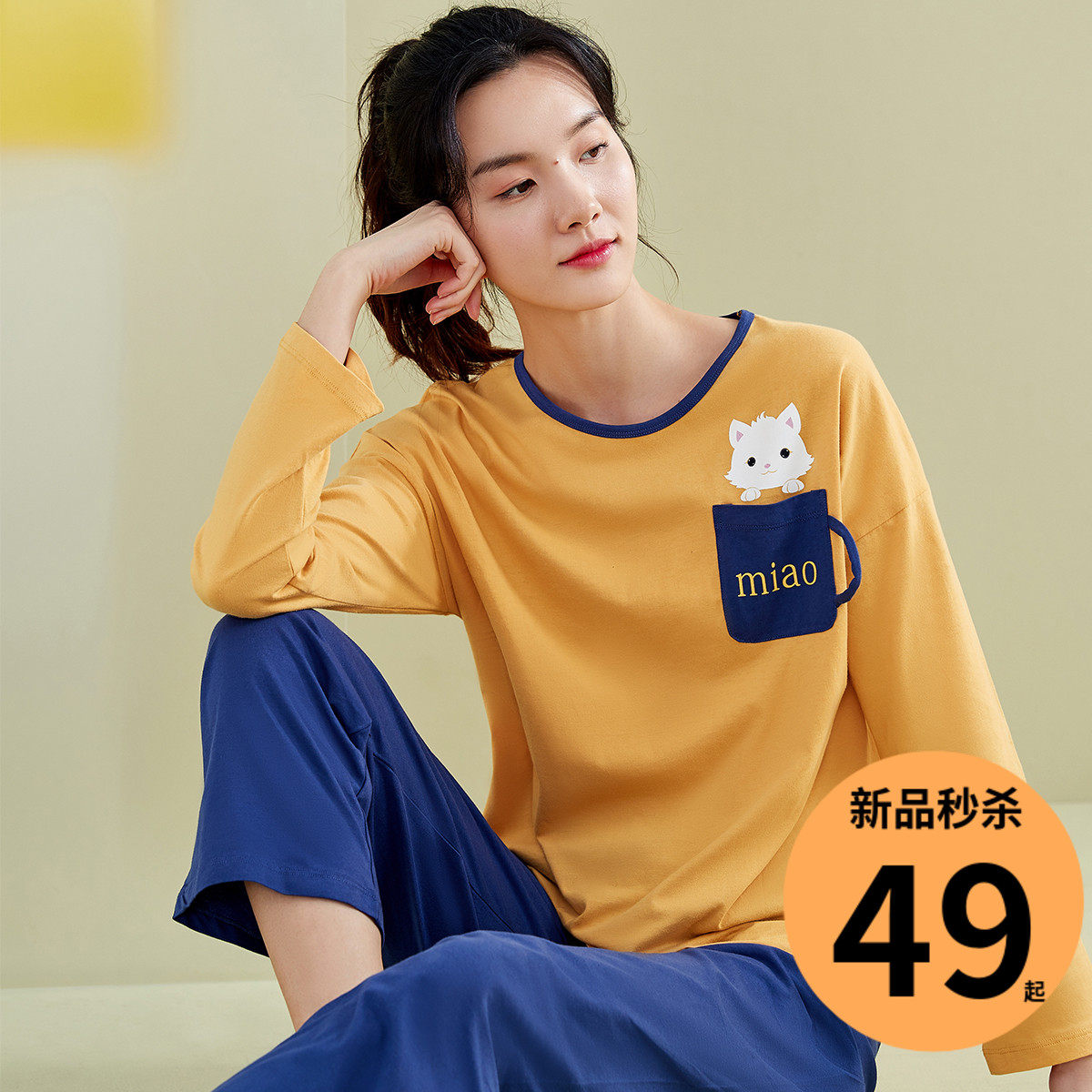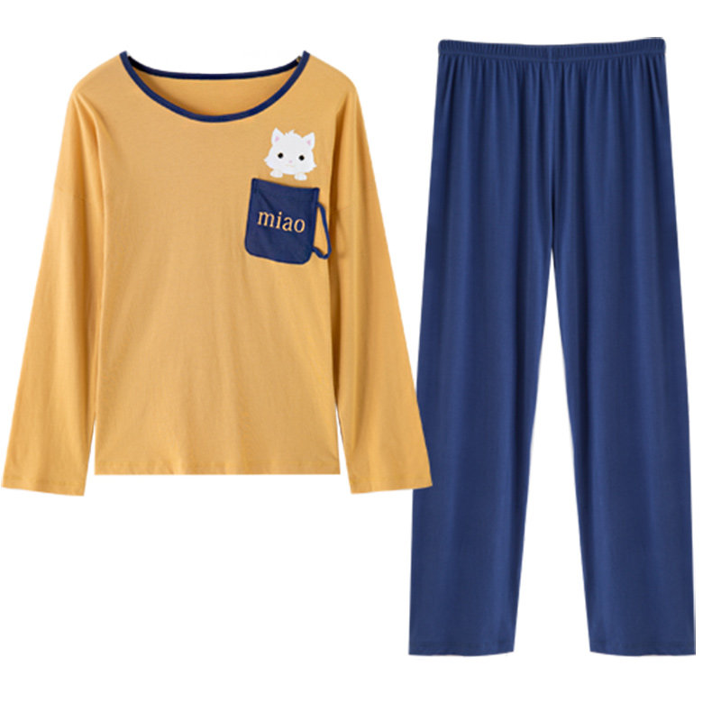 Пижама, осенний комплект, лонгслив, хлопковые штаны с круглым воротником, в корейском стиле