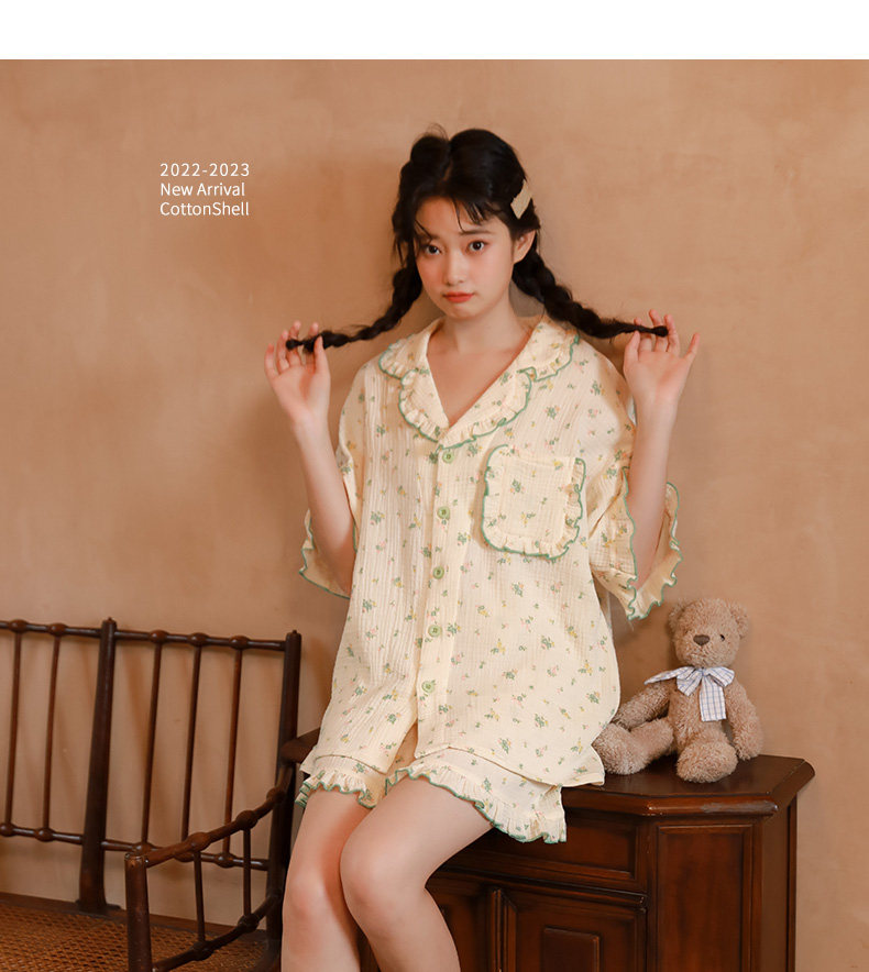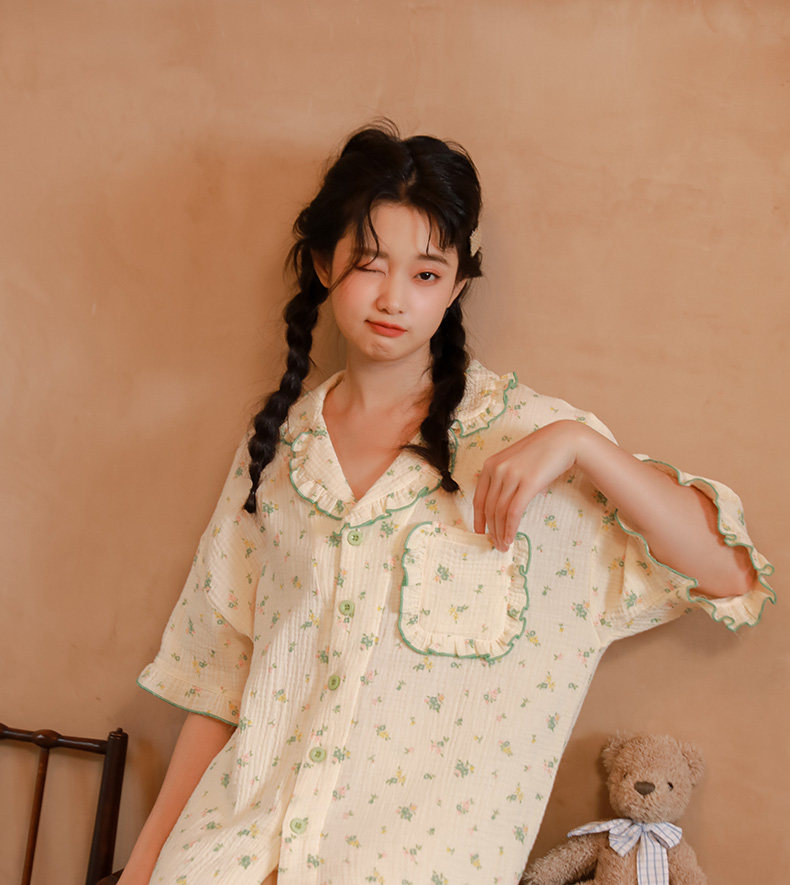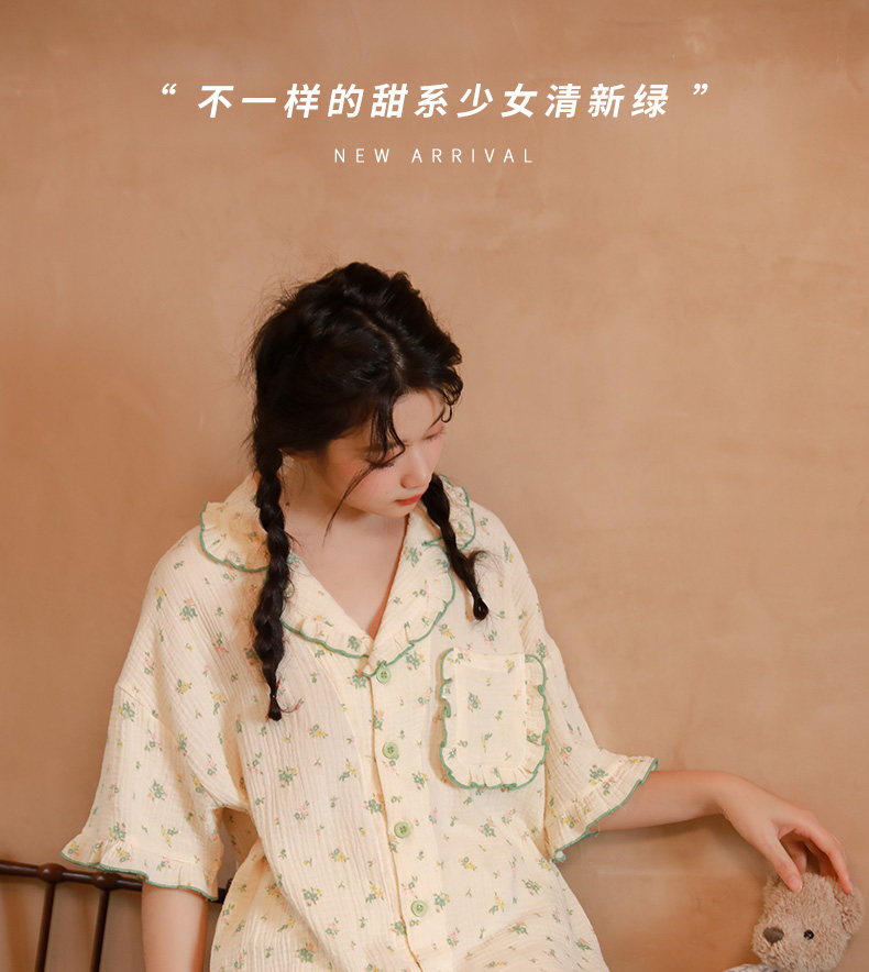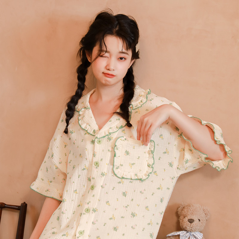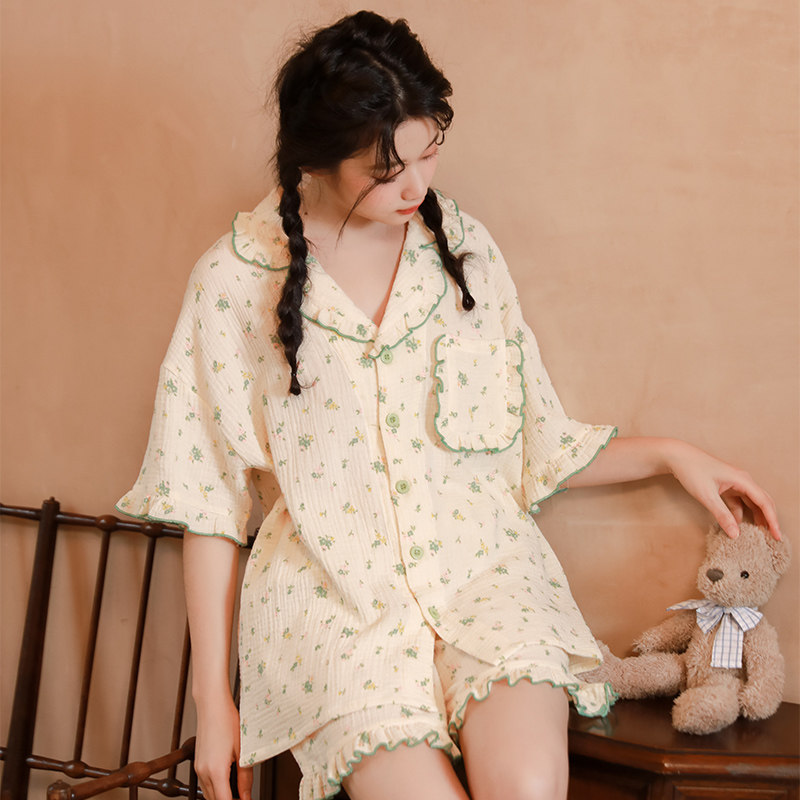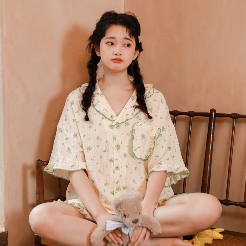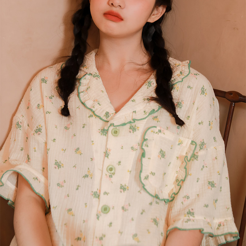 Летняя пижама, зеленый хлопковый комплект, цветочный принт, короткий рукав