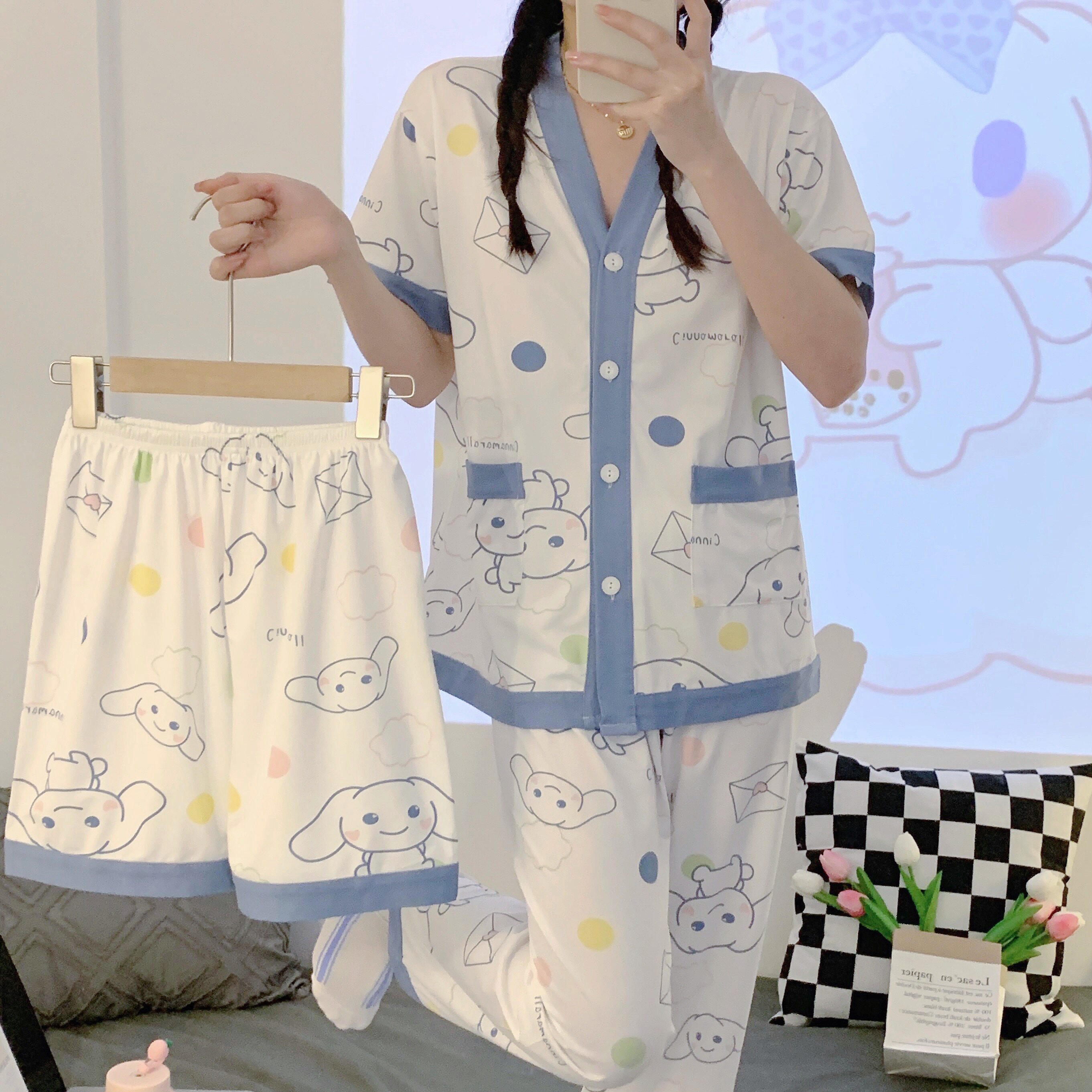 Комплект, летняя хлопковая пижама, хлопковые милые штаны, популярно в интернете, 3 предмета, изысканный стиль