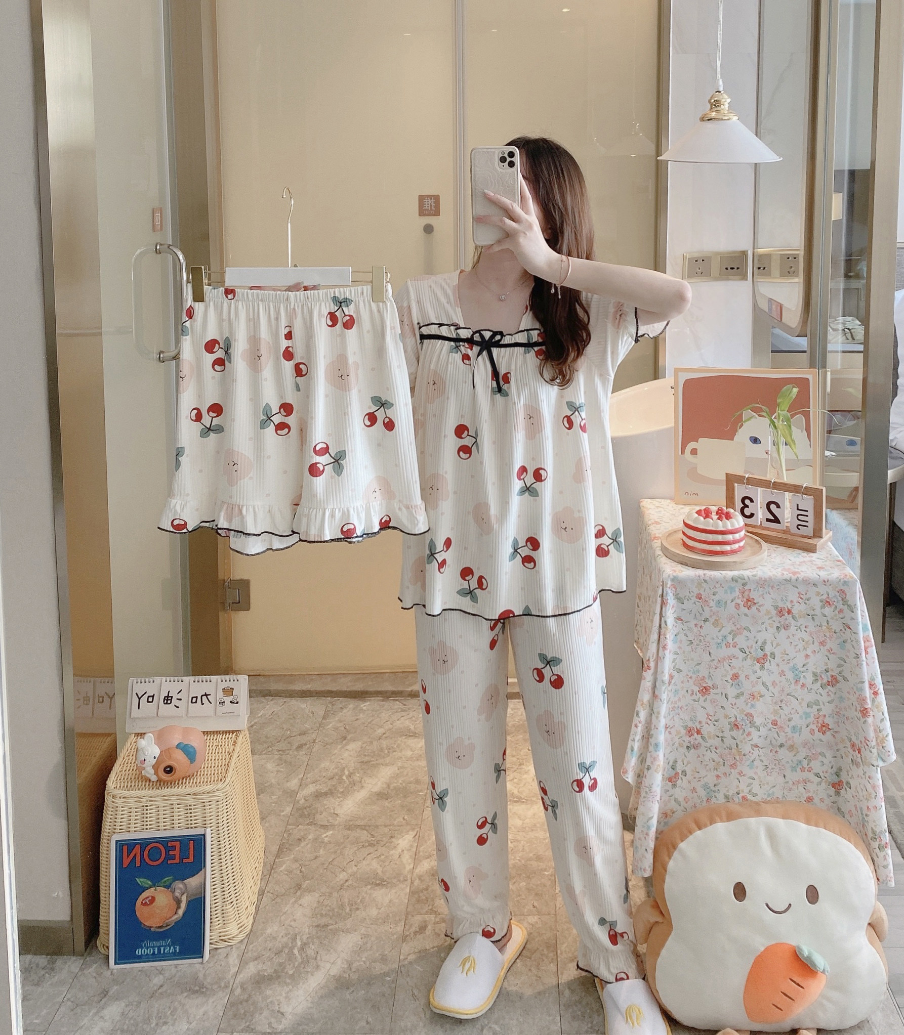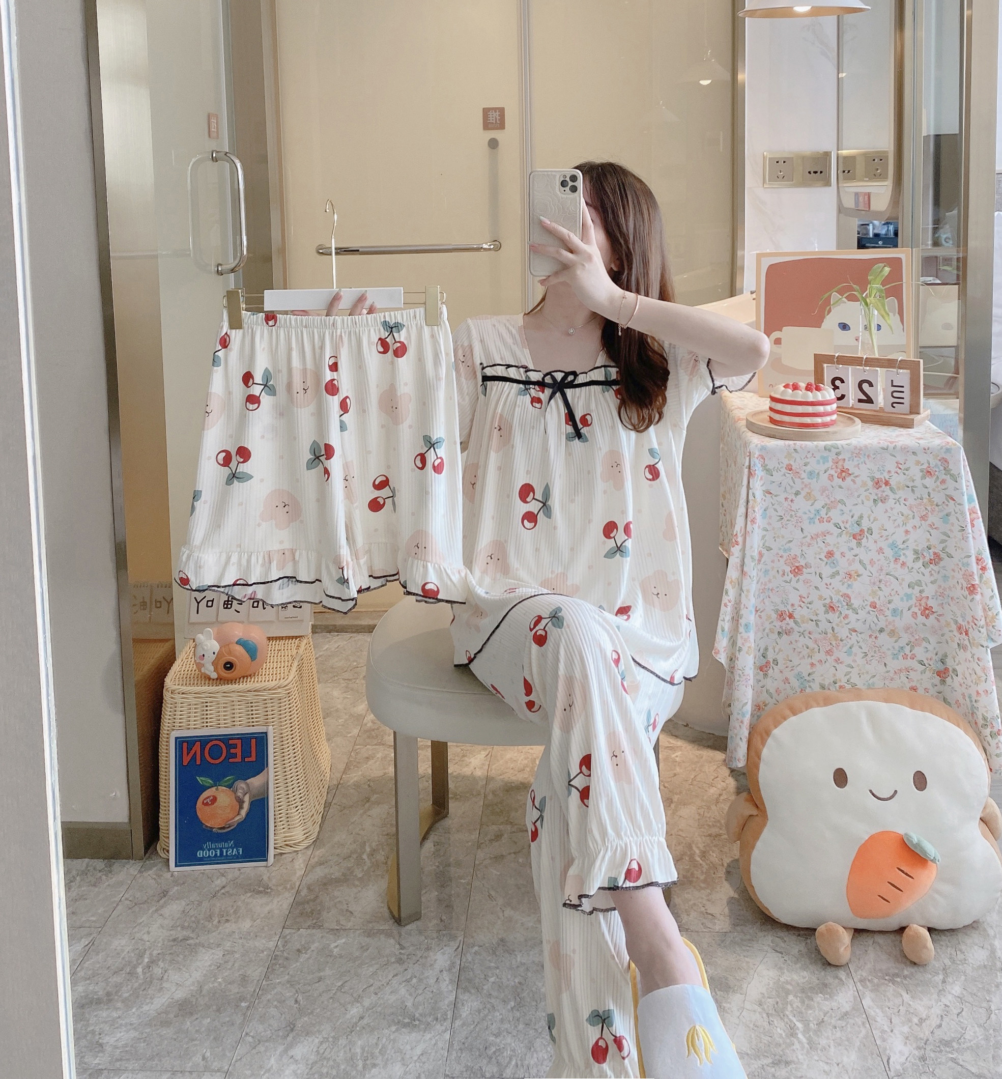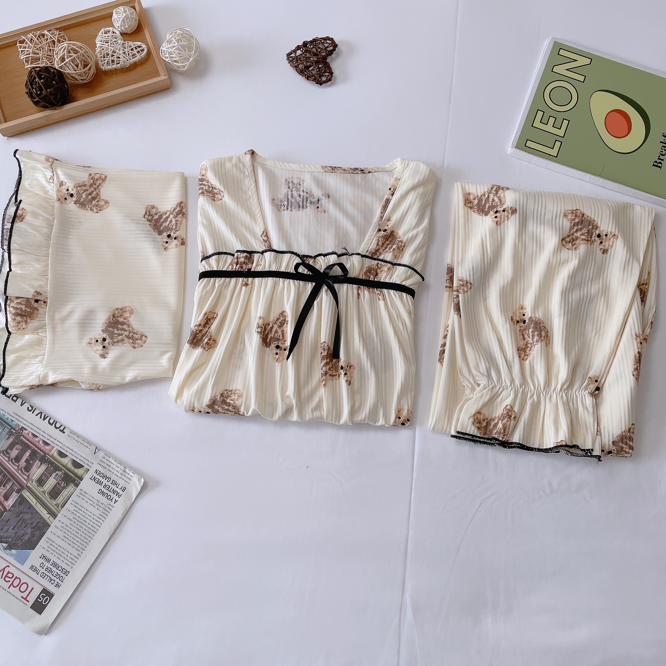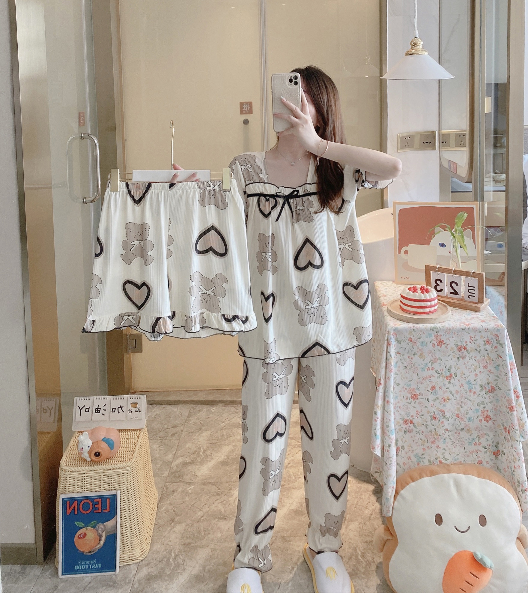 Летняя пижама, хлопковые штаны, милый тонкий комплект, короткий рукав, 3 предмета