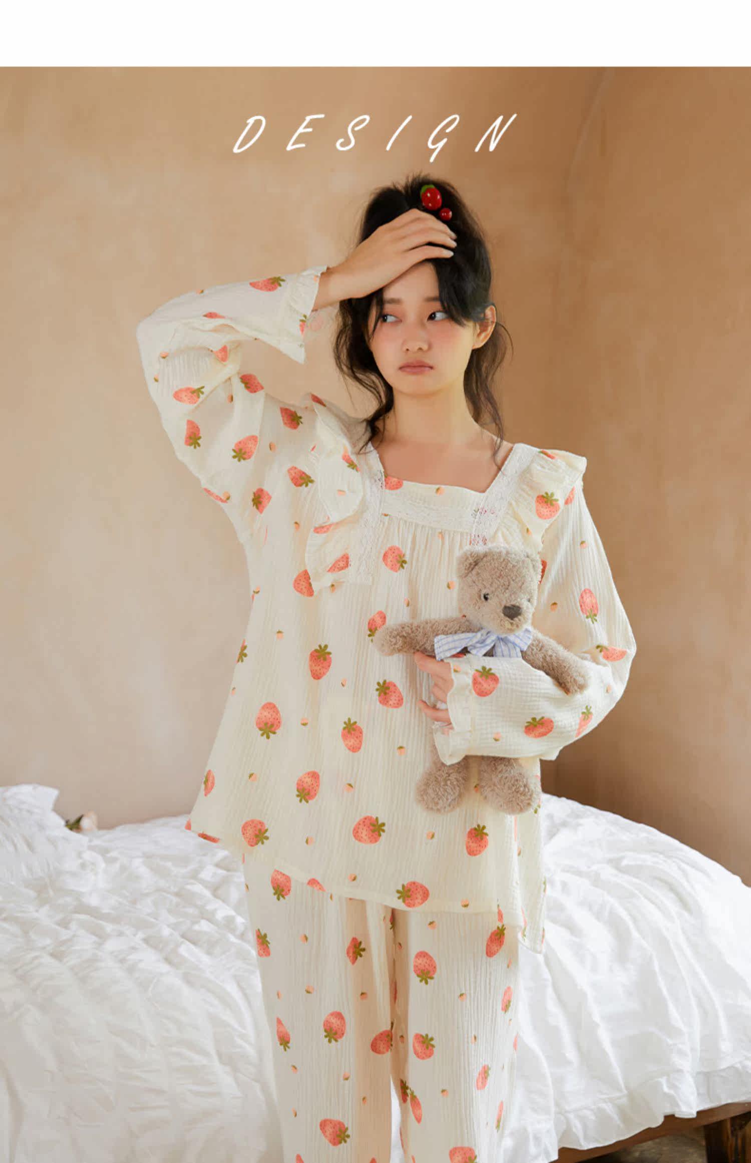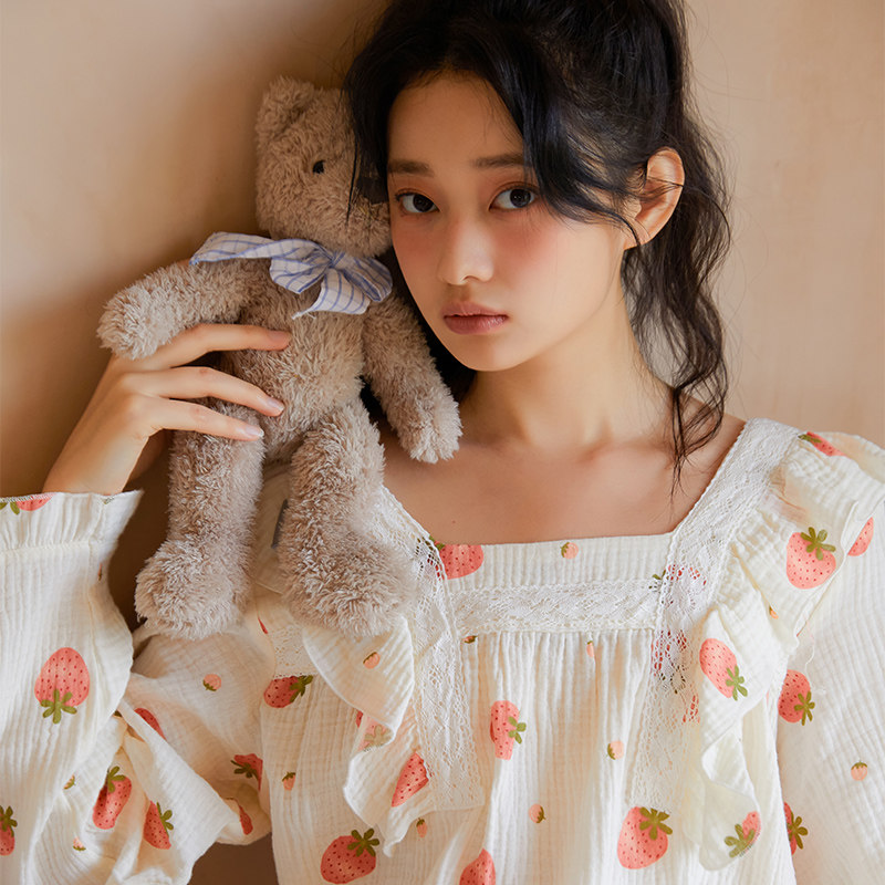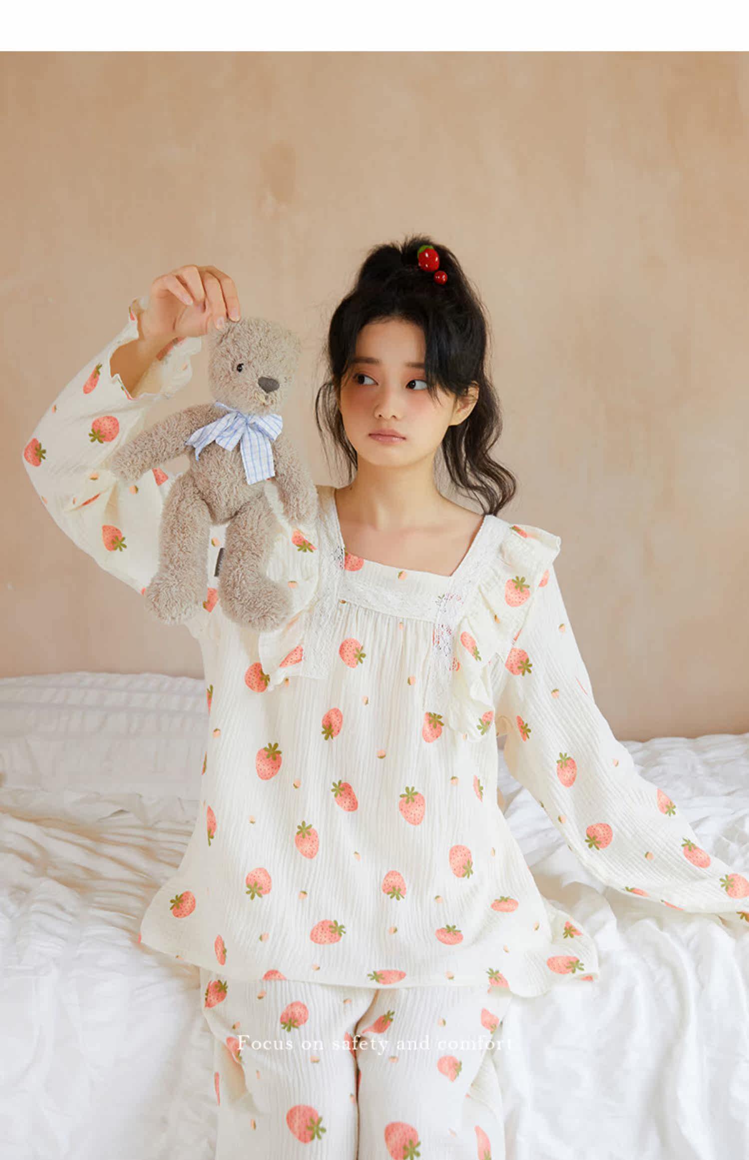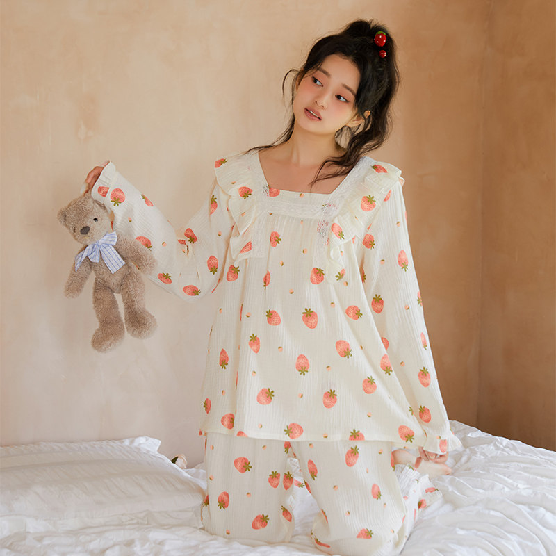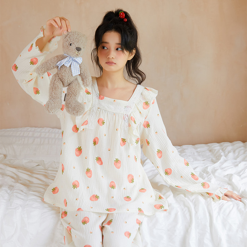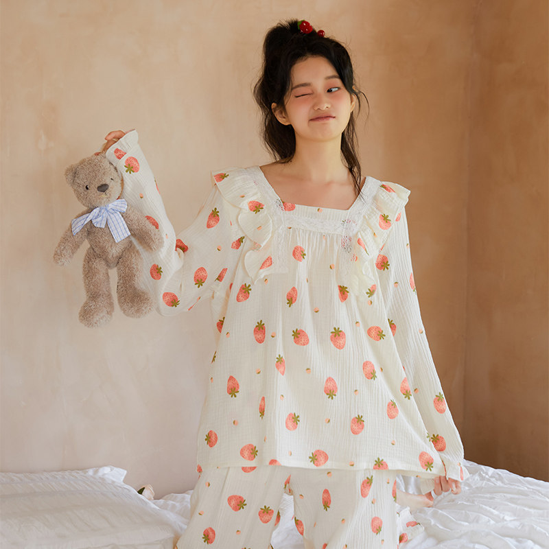Осенняя клубника, пижама, хлопковый милый лонгслив, квадратный вырез