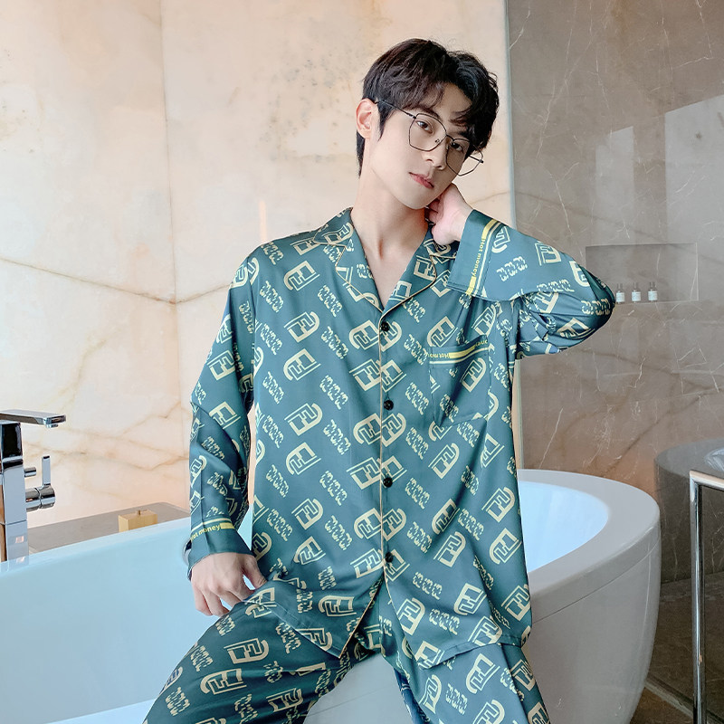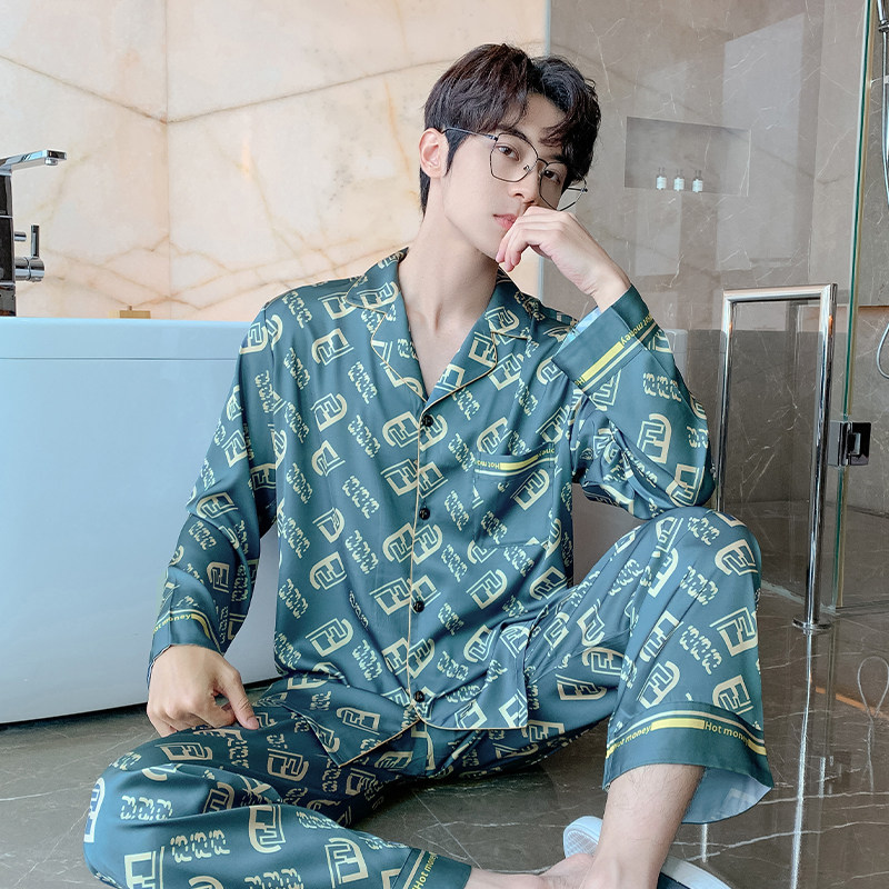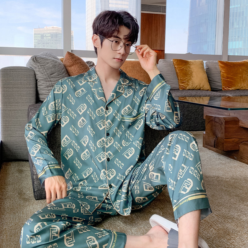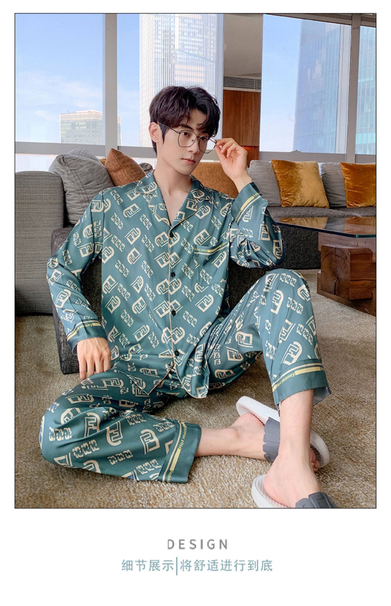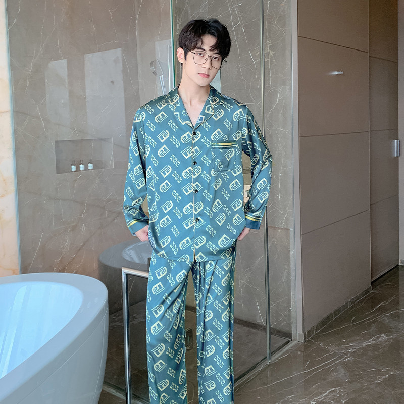 Весенняя осенняя пижама, шелковый синий лонгслив с буквами, комплект, 2022