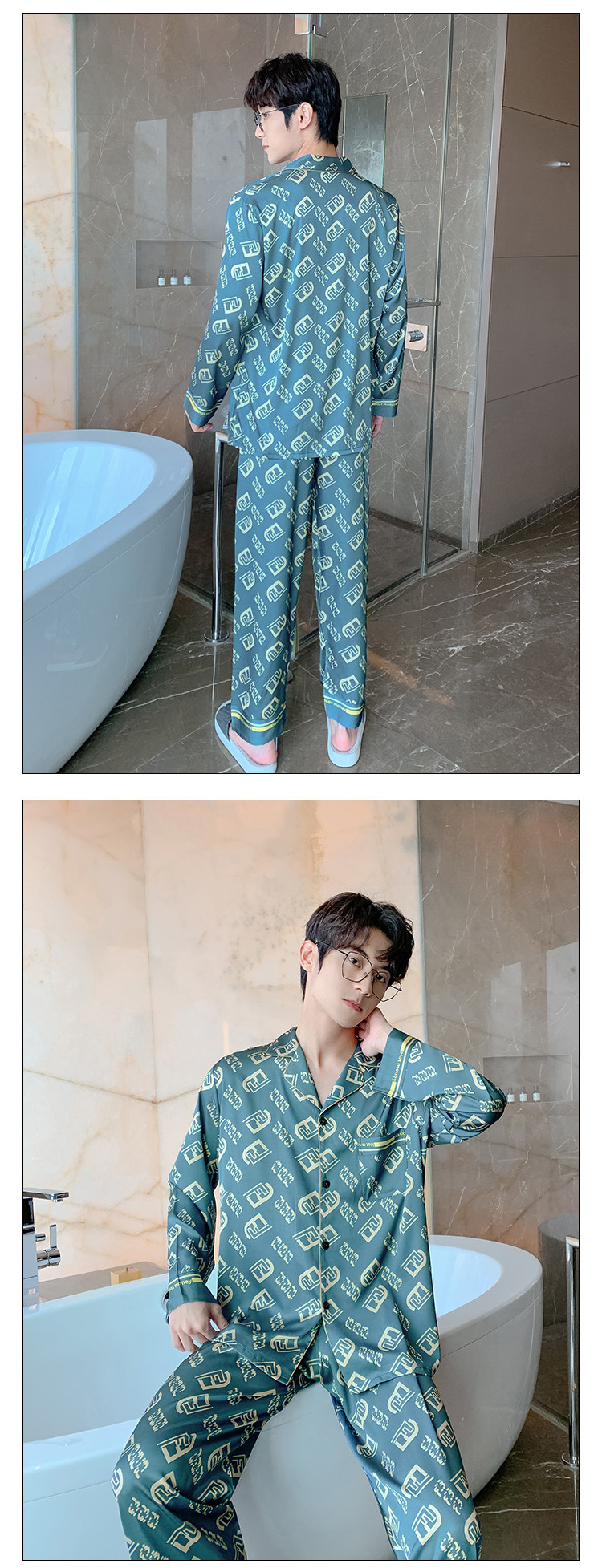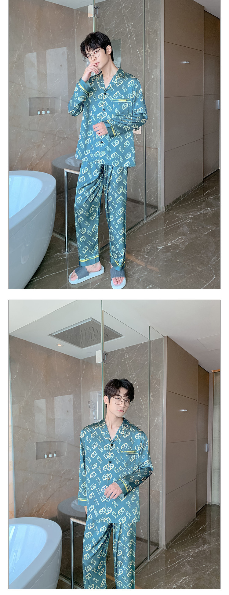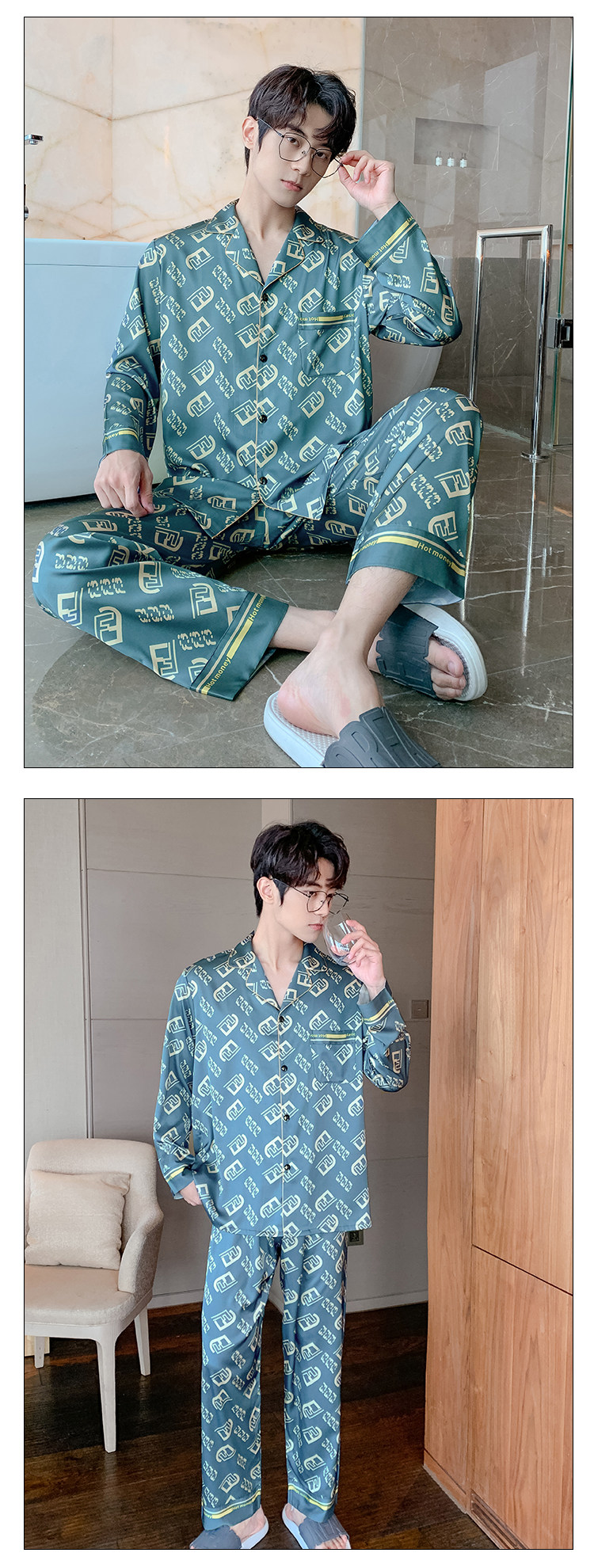 Весенняя осенняя пижама, шелковый синий лонгслив с буквами, комплект, 2022