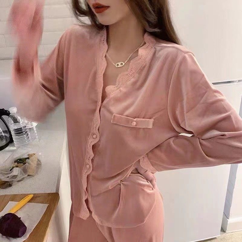Бархатный демисезонный универсальный комплект, бархатная кружевная пижама, штаны, в западном стиле, высокая талия