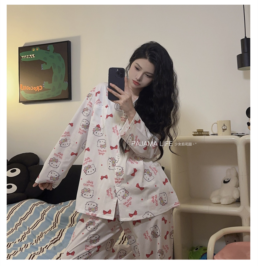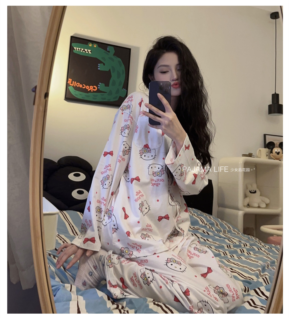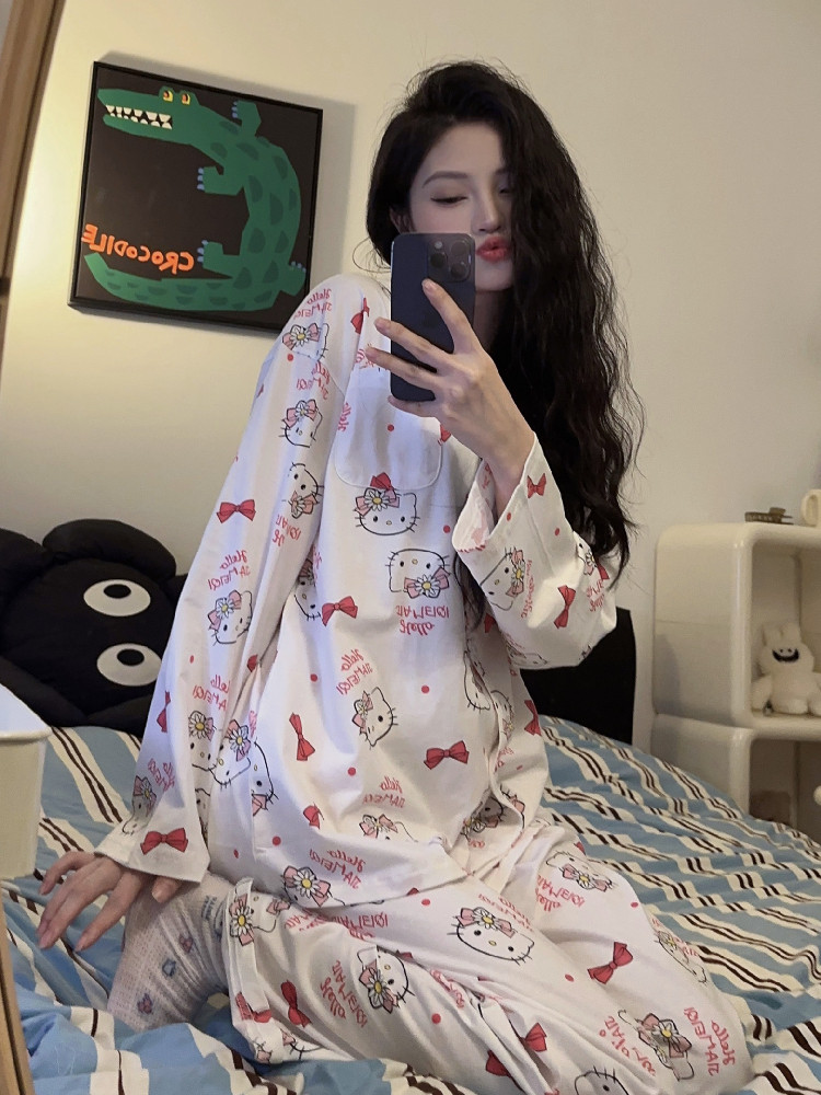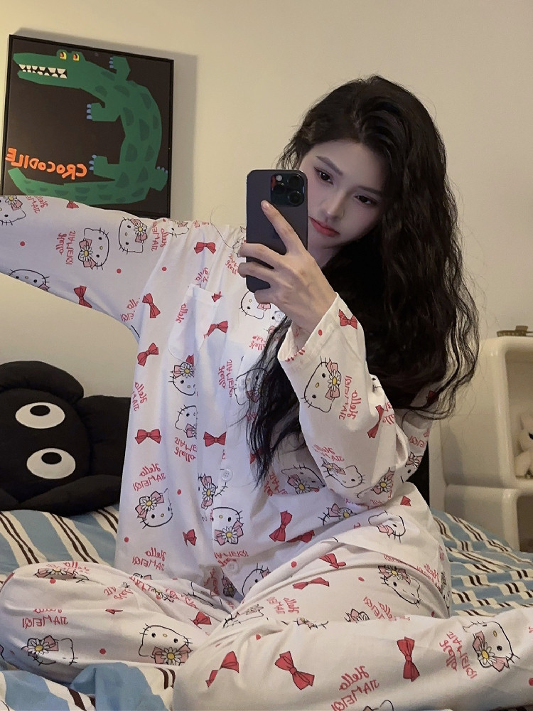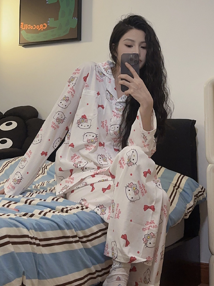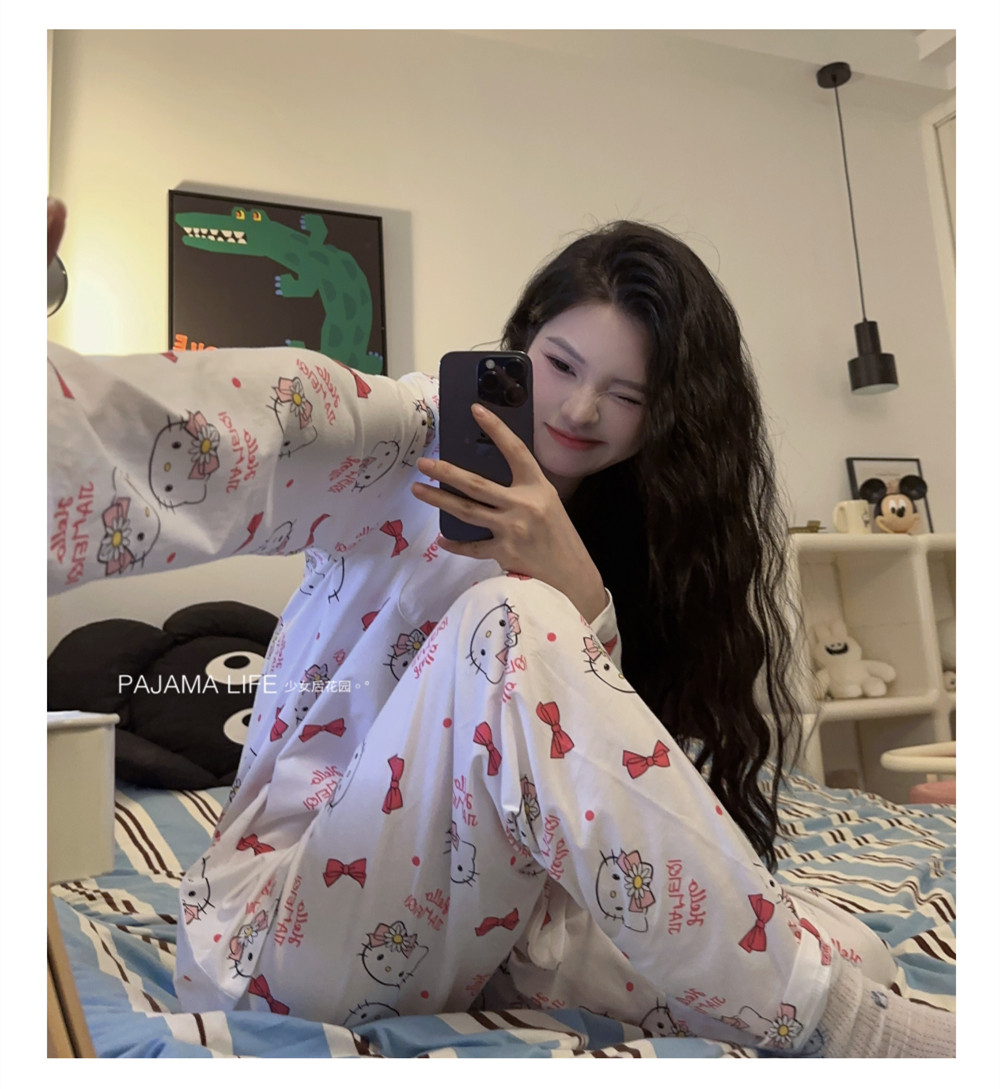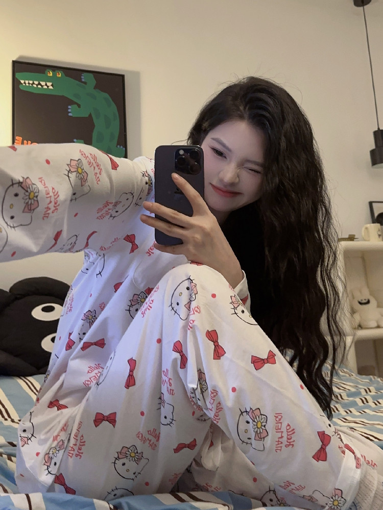 Hello Kitty, милая осенняя демисезонная пижама, хлопковый тонкий мультяшный лонгслив, милый комплект