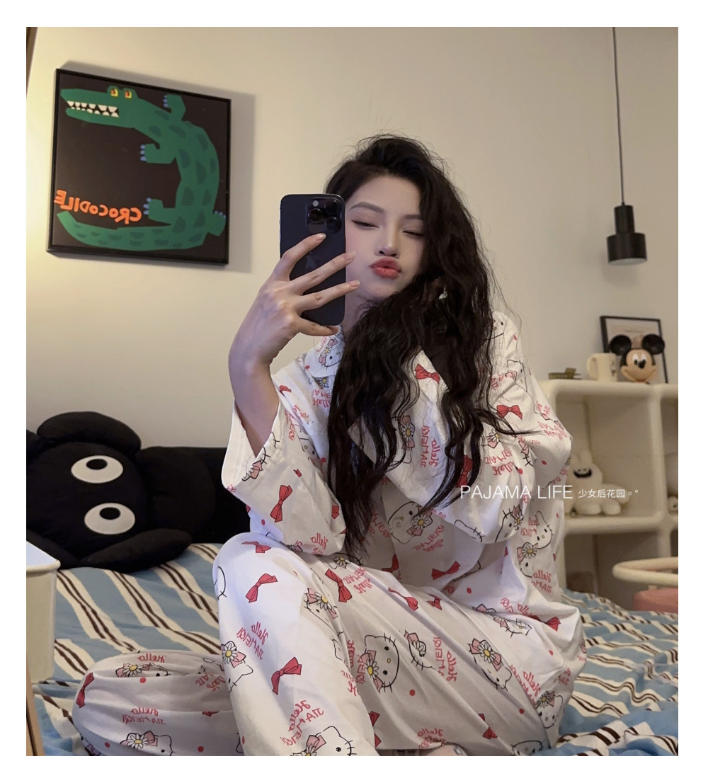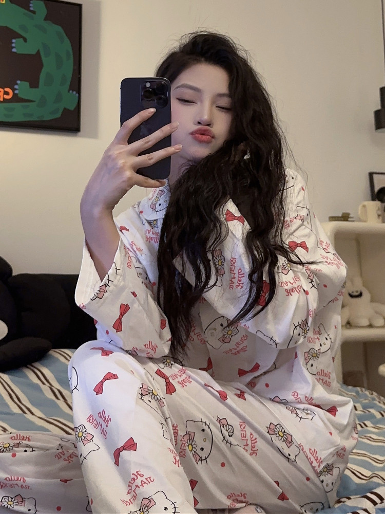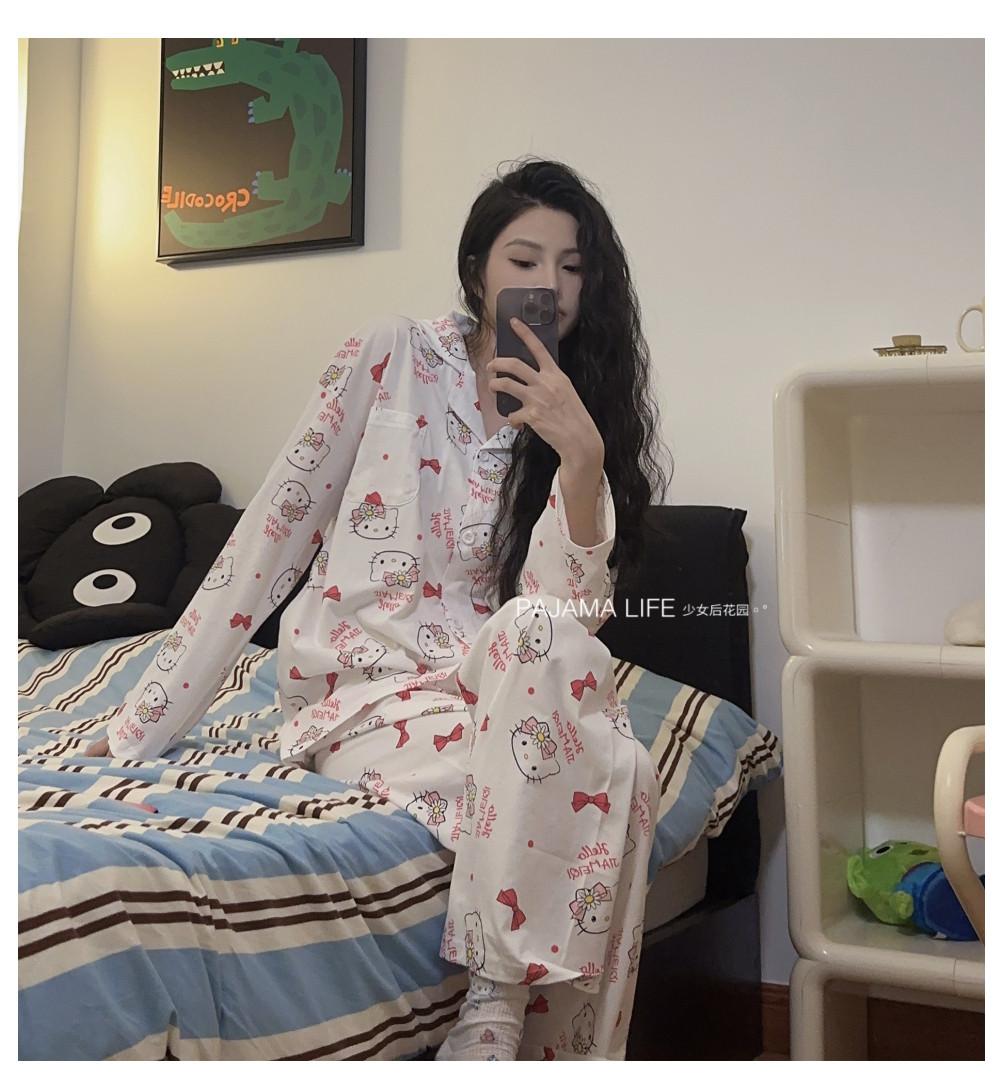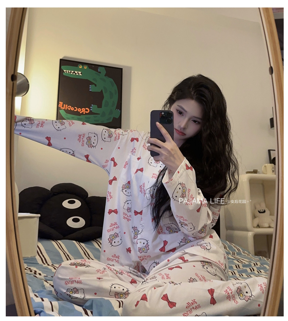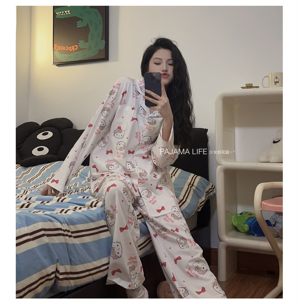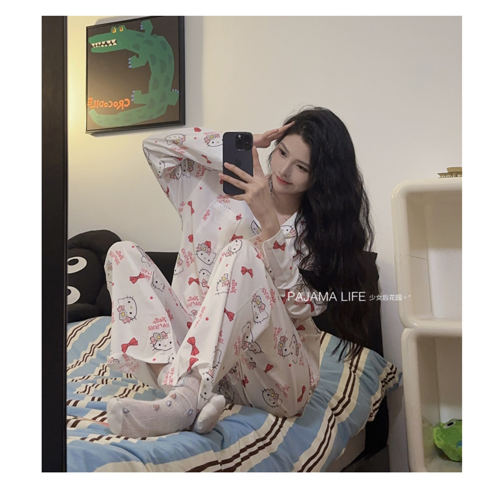Hello Kitty, милая осенняя демисезонная пижама, хлопковый тонкий мультяшный лонгслив, милый комплект