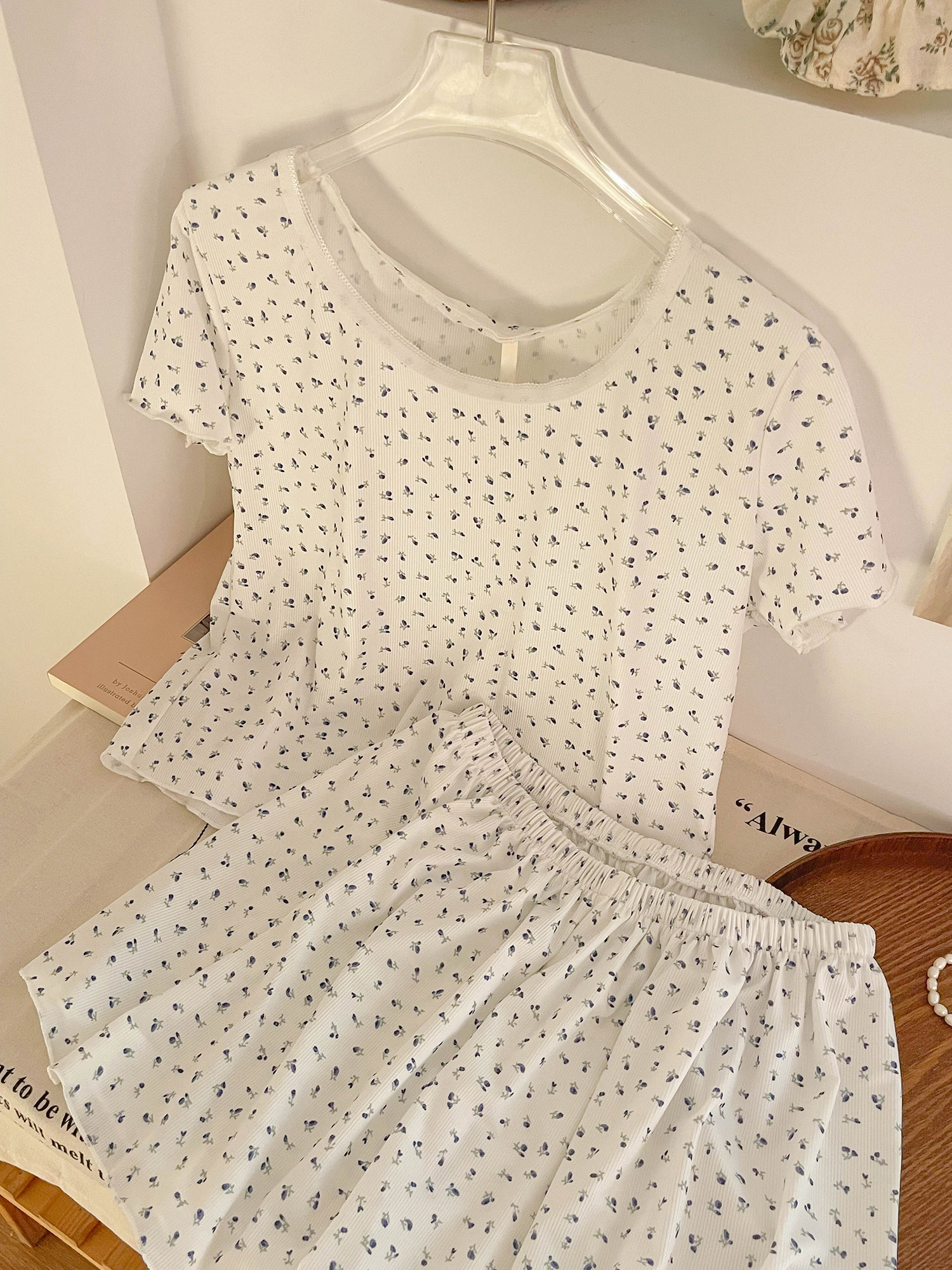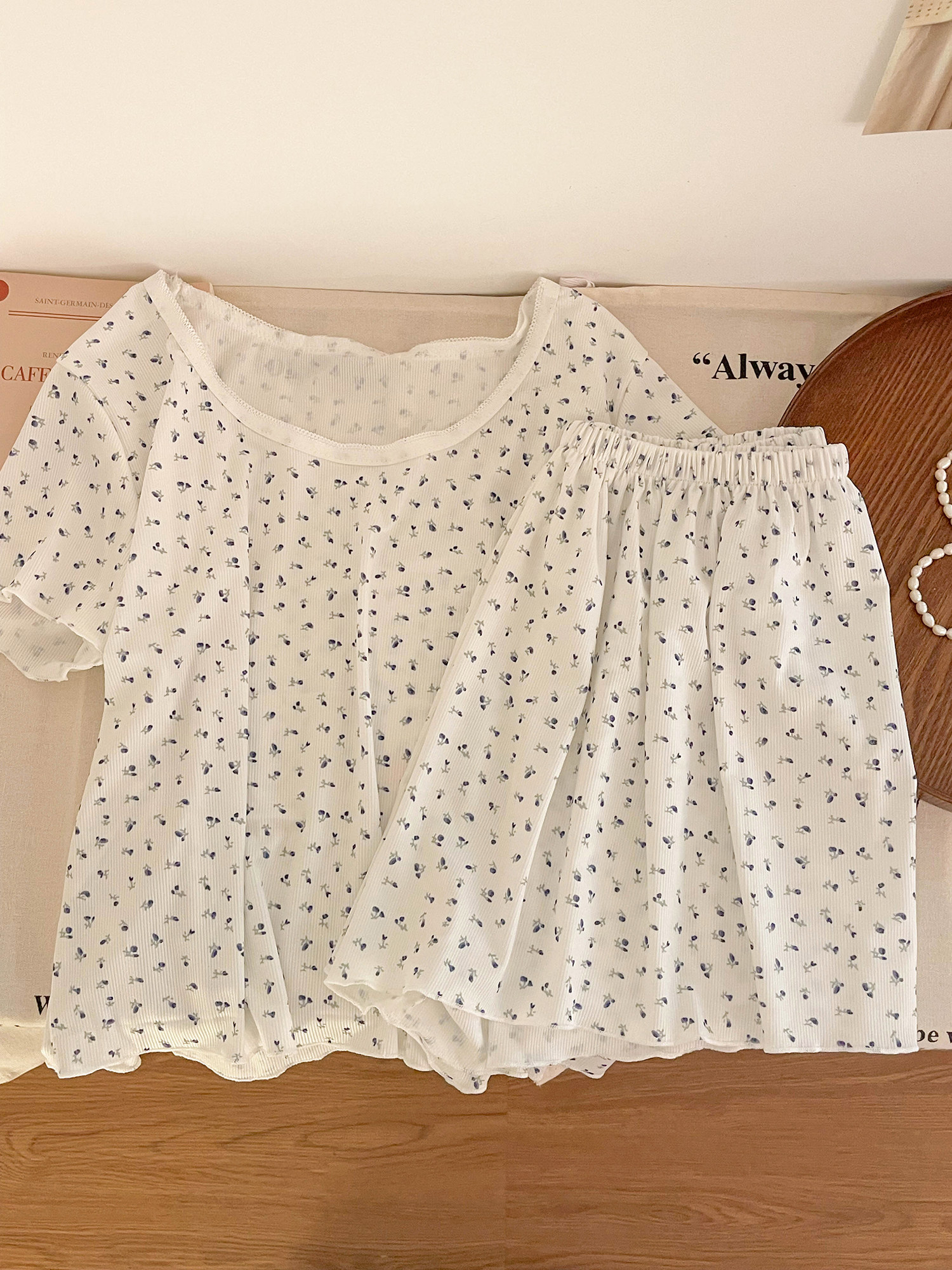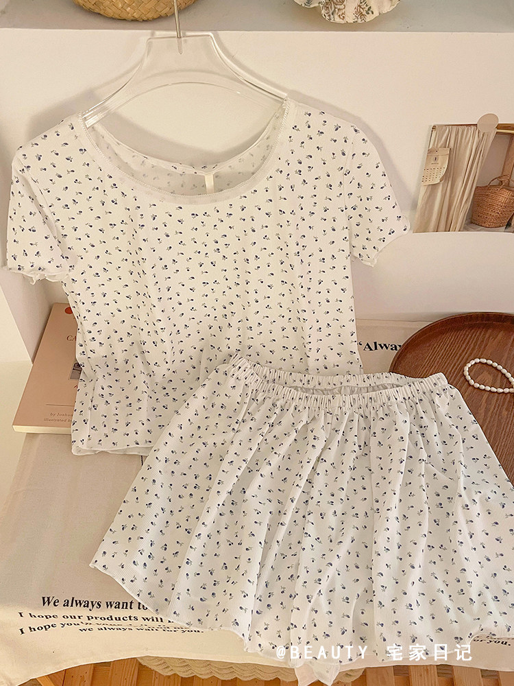 Футболка с коротким рукавом, летняя пижама, комплект, летний костюм, цветочный принт, облегающий крой, короткий рукав, популярно в интернете, большой размер