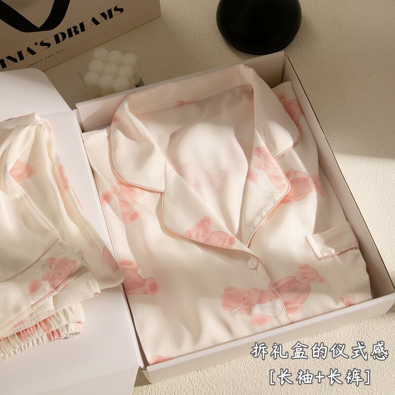 Милая шелковая осенняя пижама, лонгслив, подарочная коробка, с медвежатами, изысканный стиль, подарок на день рождения
