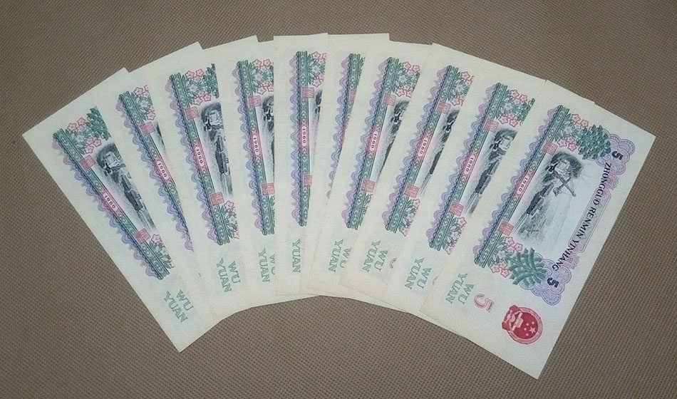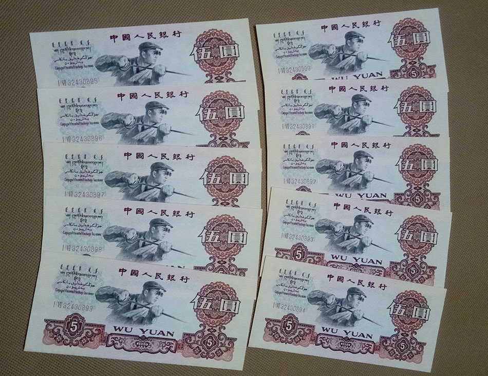 Новый третий набор 3 -й версии RMB Training Steel Workings 5 Yuan Banknote 1960 Five Yuan New Standard 10 10 последовательных чисел