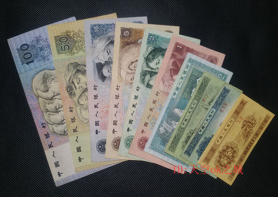 Полный набор включает в себя 100 юаней в 1990 году. 50 Юань в 1990 году.в 1980 году10 Юань.в 1980 году5 Юань.19902 Юань.19961 Юань.в 1980 году2 угла.5 очков в 1953 году. В 1953 году 2 балла. Топ 12 вместе