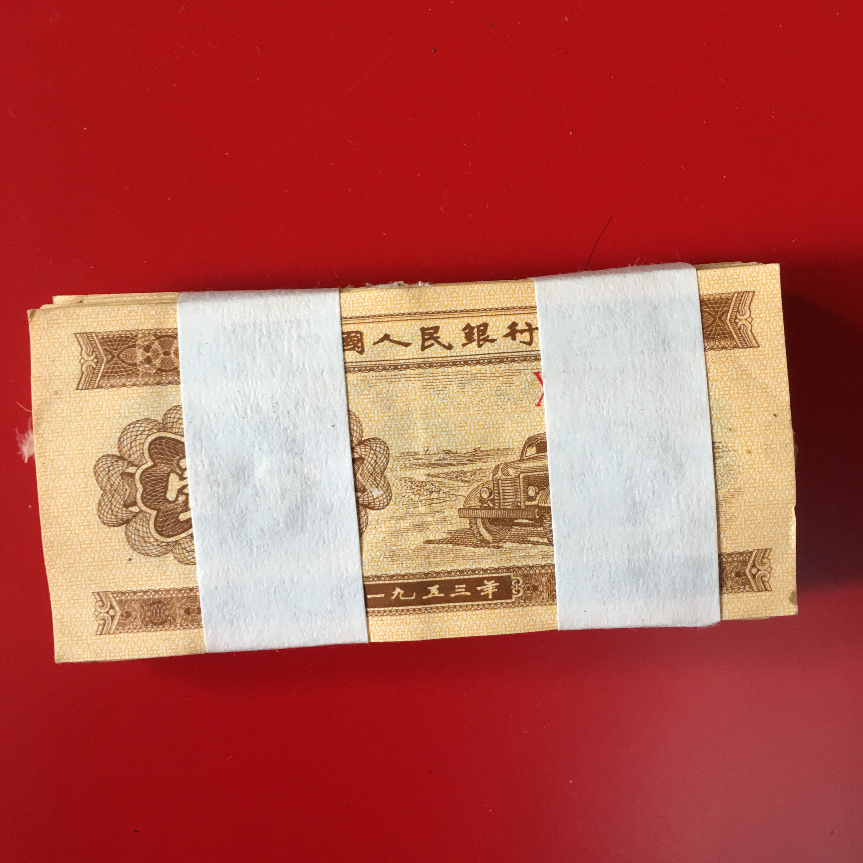 Версия банкнот 1953 года, основной цвет - бежевый, передний рисунок - это автомобиль, образец задней части - задний рисунок“Национальная эмблемаиНародный банк КитаяОдин пункт&Rdquo; четыре типа текстовых схем: Хан, Монголия, Виктория и Тибетская (в первом комплексном дизайне RMB используется четыре этнического текстового дизайна), размер билета - 90 мм&Раз; 42,5 мм.