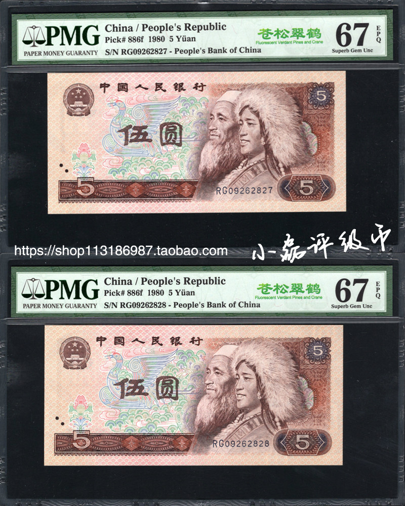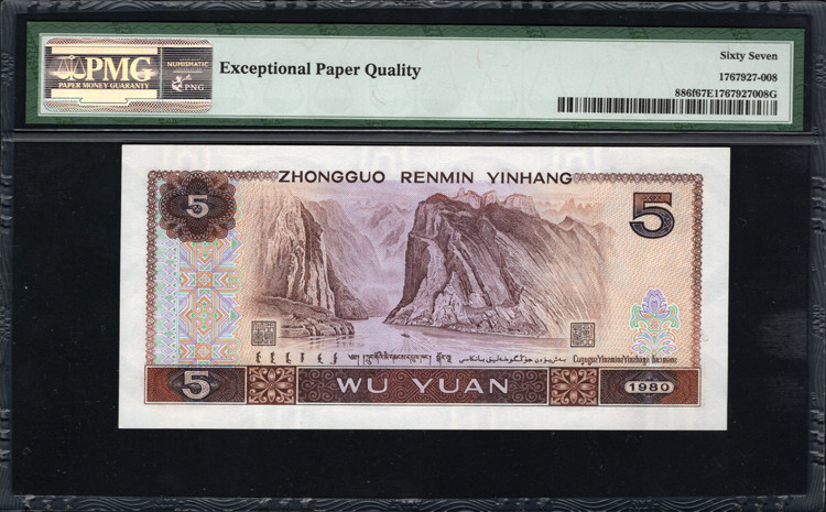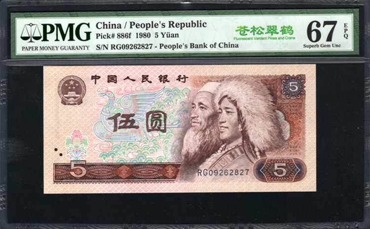 PMG Rating 67 очков 67 баллов. Четвертый набор из RMB 1980 Four Edition, пять флуоресцентных монет Yuan 805, Cangsong Cuchin