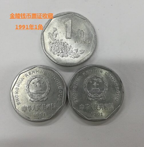 Большая десятицентовая монета с хризантемой 1991 года выпуска, хорошее тиражное качество, год четко написан, серьезных дефектов нет.