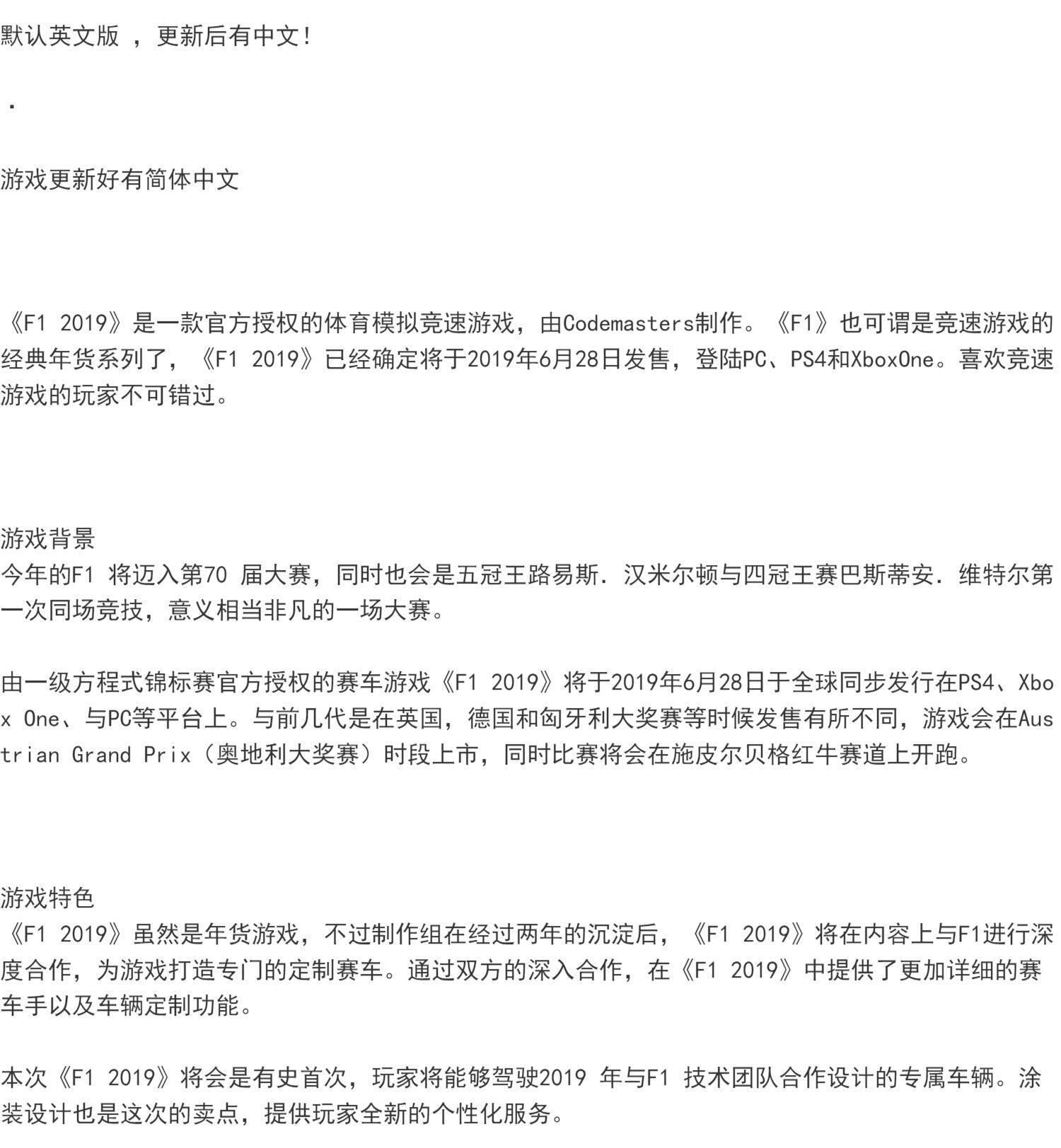 PS4 Second -Hand Game F1 First -Class Formula F1 2019 Китайская пятна