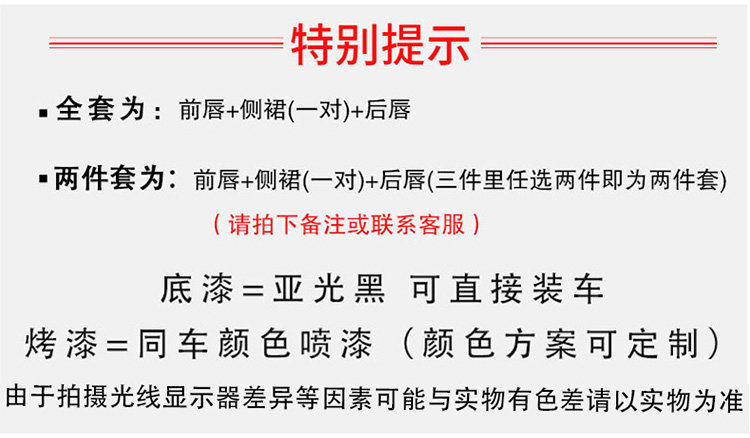 | Цвет: | Передний погрузчик с губами, Задняя часть губ, Передняя помада (многоцветная дополнительная), Задняя полоса губы (многоцветная дополнительная), Хвостовая полость (многоцветная опция), Боковая юбка/пара, Боковая юбка/пара (многоцветная дополнительная), Краска с двумя частями (выберите две части в полном наборе), Полный сет-праймер, Полный набор краски+хвост, Два набора (выберите две части в полном наборе), Полная установка (многоцветная необязательная), Полный набор краски+заднего крыла |
