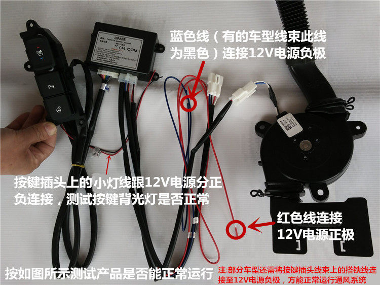 Как показано на рисунке ниже, подключите продукт к источнику питания 12 В и нажмите кнопку нагрева вентиляции для тестирования.(Принесите отопление также необходимо проверить линейку продуктов отопления. Короткая запасная штеплянка рядом с синим проводом ниже - штепрей для отопления)