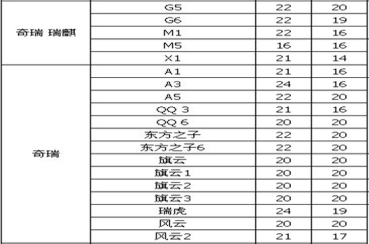 | Цвет: | Циюнь/Циюнь 2/Циюнь 3 (20+20), Шторм 2 (21+17), Е3(22+16), А3(24+16), А5/Е5 (22+20), QQ3/A1(21+16), Тигго/Тигго 3 (24+19), QQ6/Циюнь 1(20+20), M1(22+16), X1(21+14), Сын Востока (22+20), G5(22+20), G6(22+19), Аррисо 3 (22+14), Тигго 5 (26+18), Вейлин V5 (26+18) |