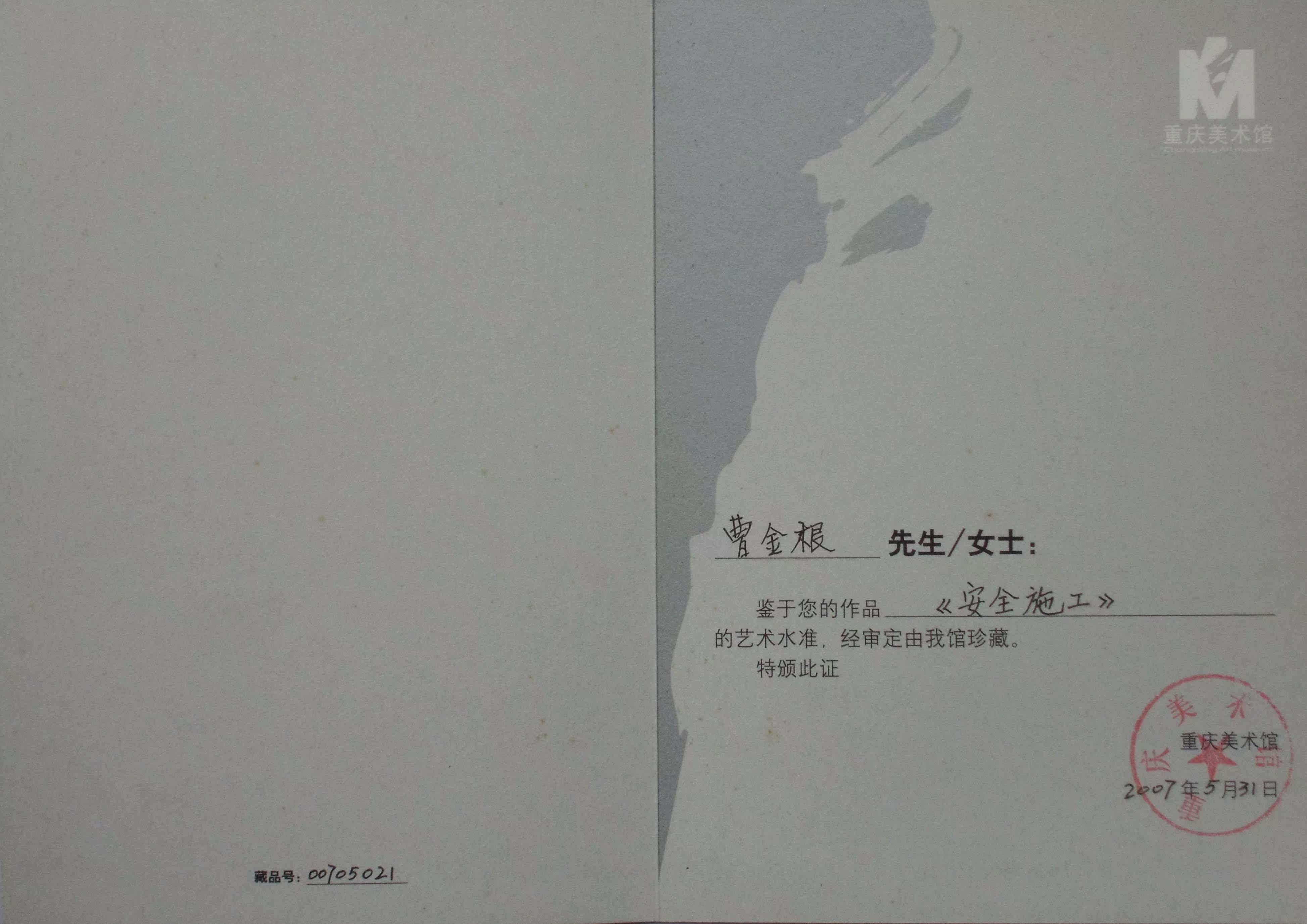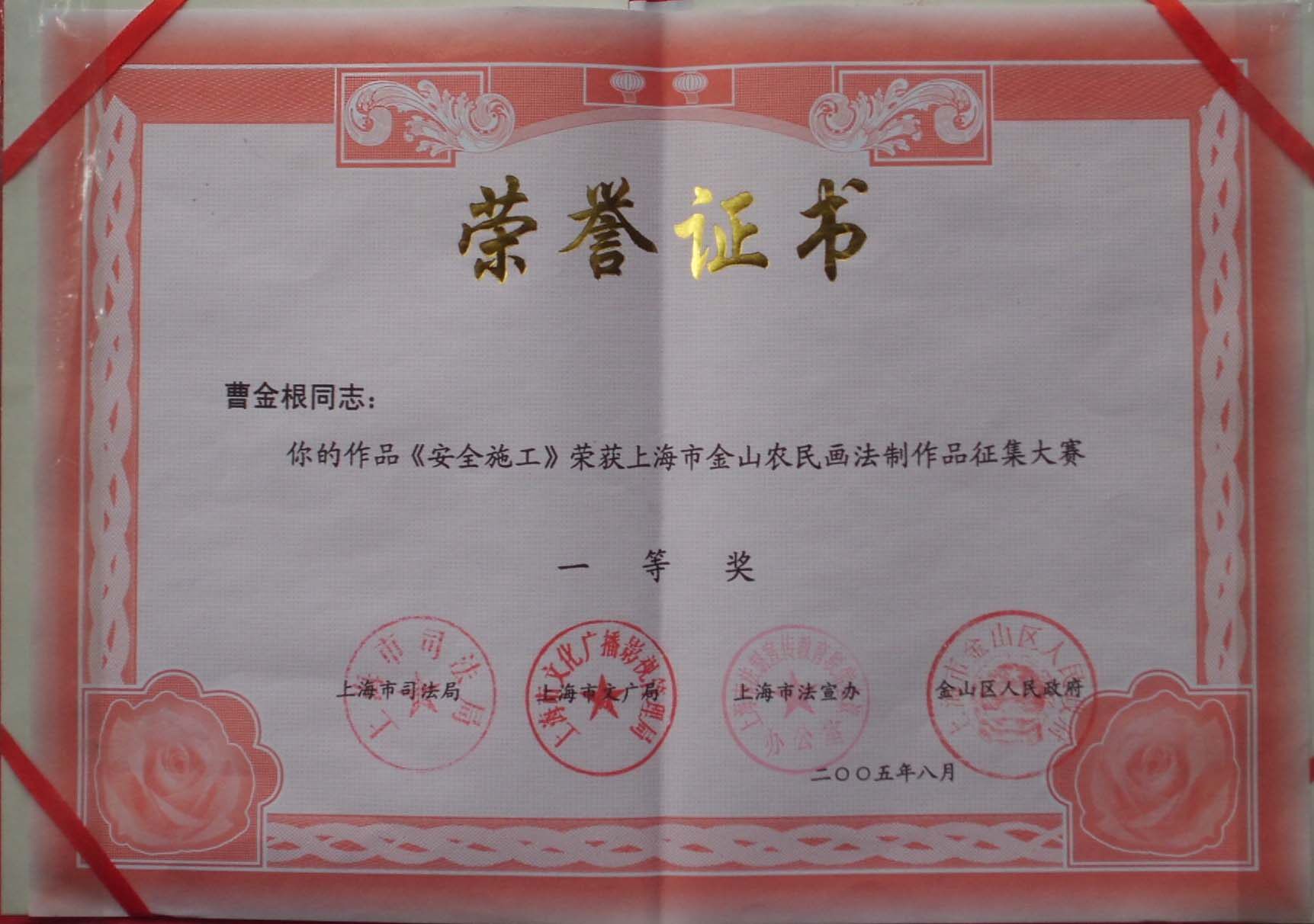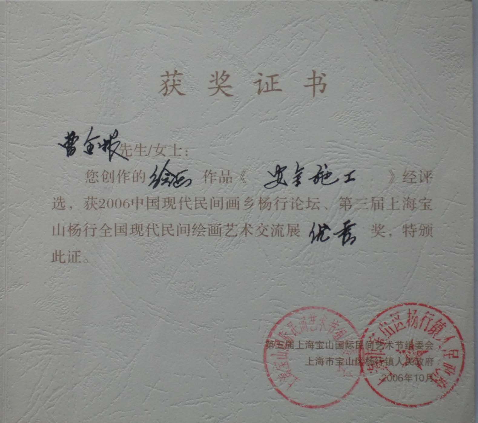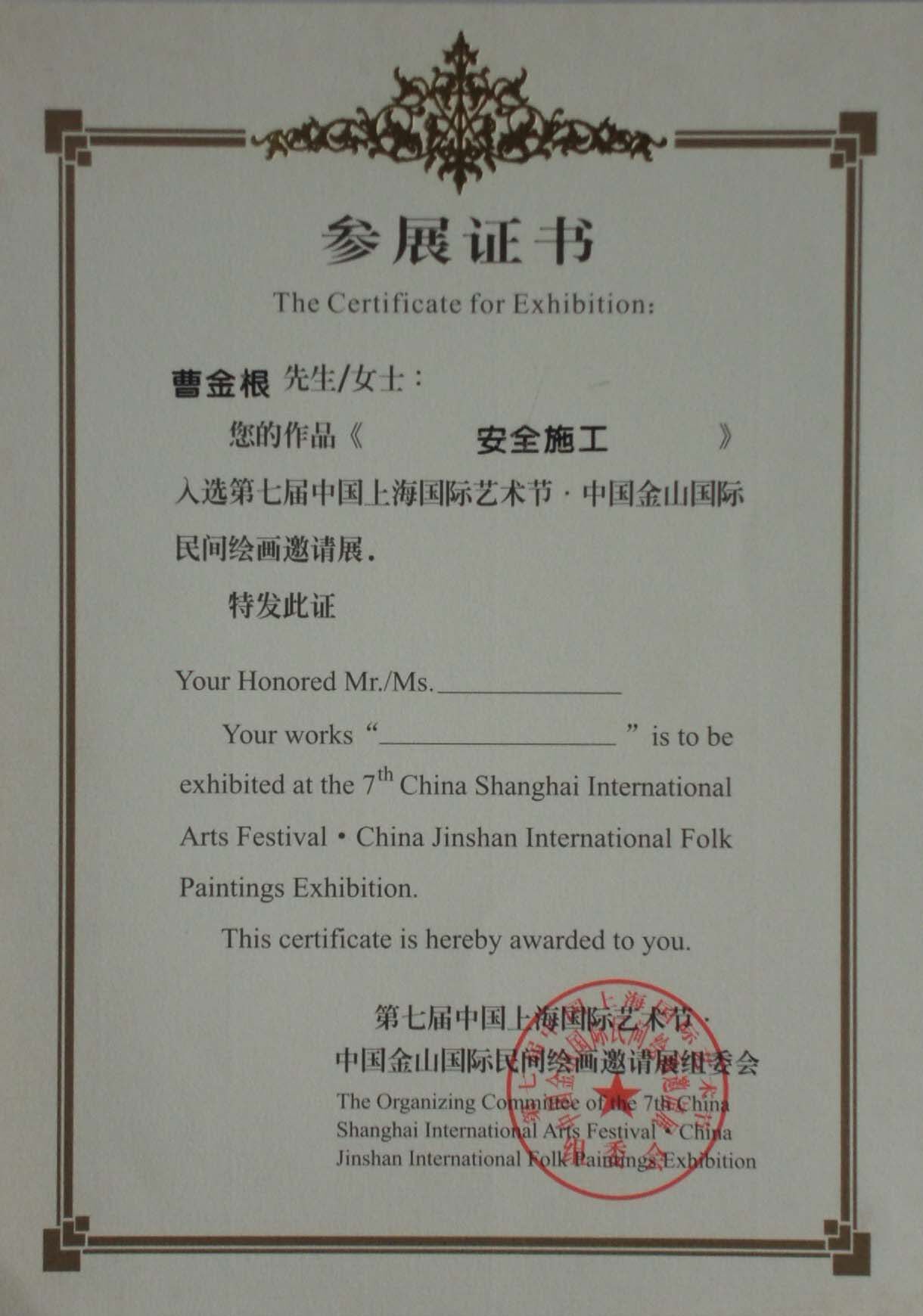 Сертификат премии Cao Jingen (Джиншанской крестьянской картины) «Безопасное строительство»
