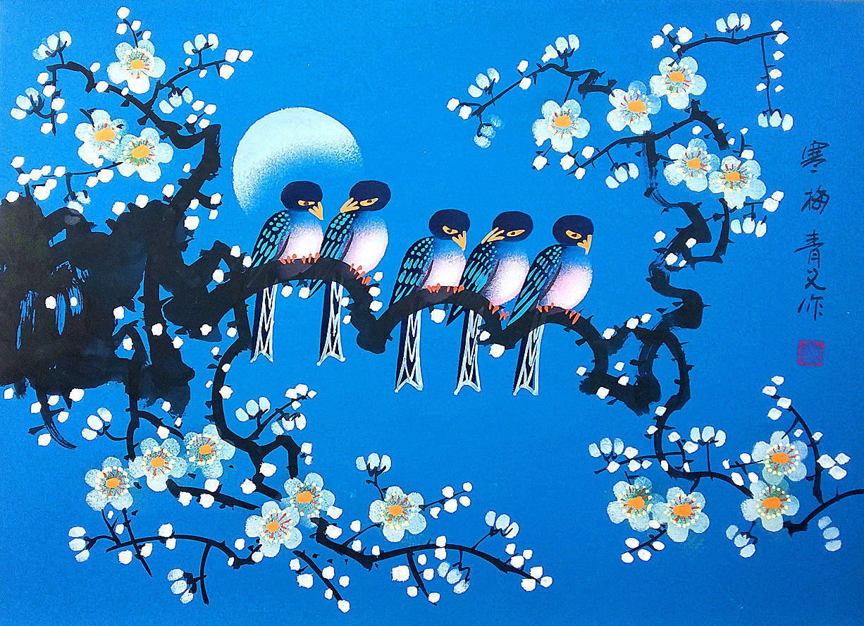 Hanmei Callicraphy and Painting Plum Blossom Bird Hotel Home Musting Music Zhang Qingyi House Farmers Painting Размер 52x38 см.