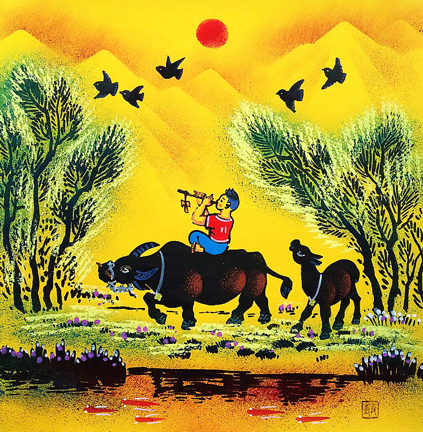 Пастырские песни, пастухи, катаясь на коровах, декоративная каллиграфия и картины, пастырские песни, сельские районы, картины Хусианских крестьян, размеры 25x25 см.