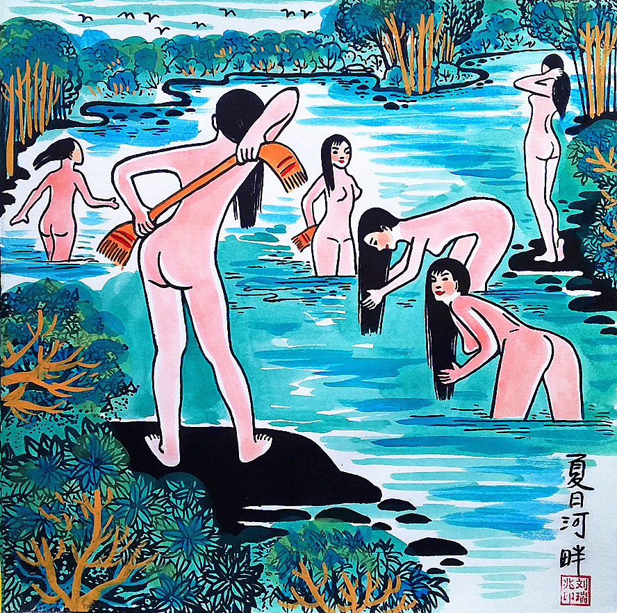 Река на берегу девочка, красивая девушка для ванны голая купание Шэанси Хусиан Фермеры Рассказы о размере 25x25 см.