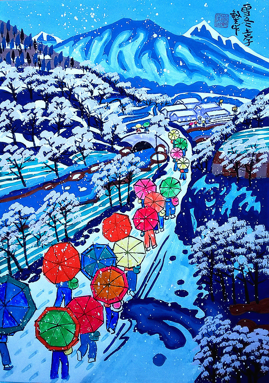 Школа сельской начальной школы ходят в школу в школе зимняя снежная сцена, Атмерелл, графство Ченгмин Шенгу, размер живописи фермеров 52x38см