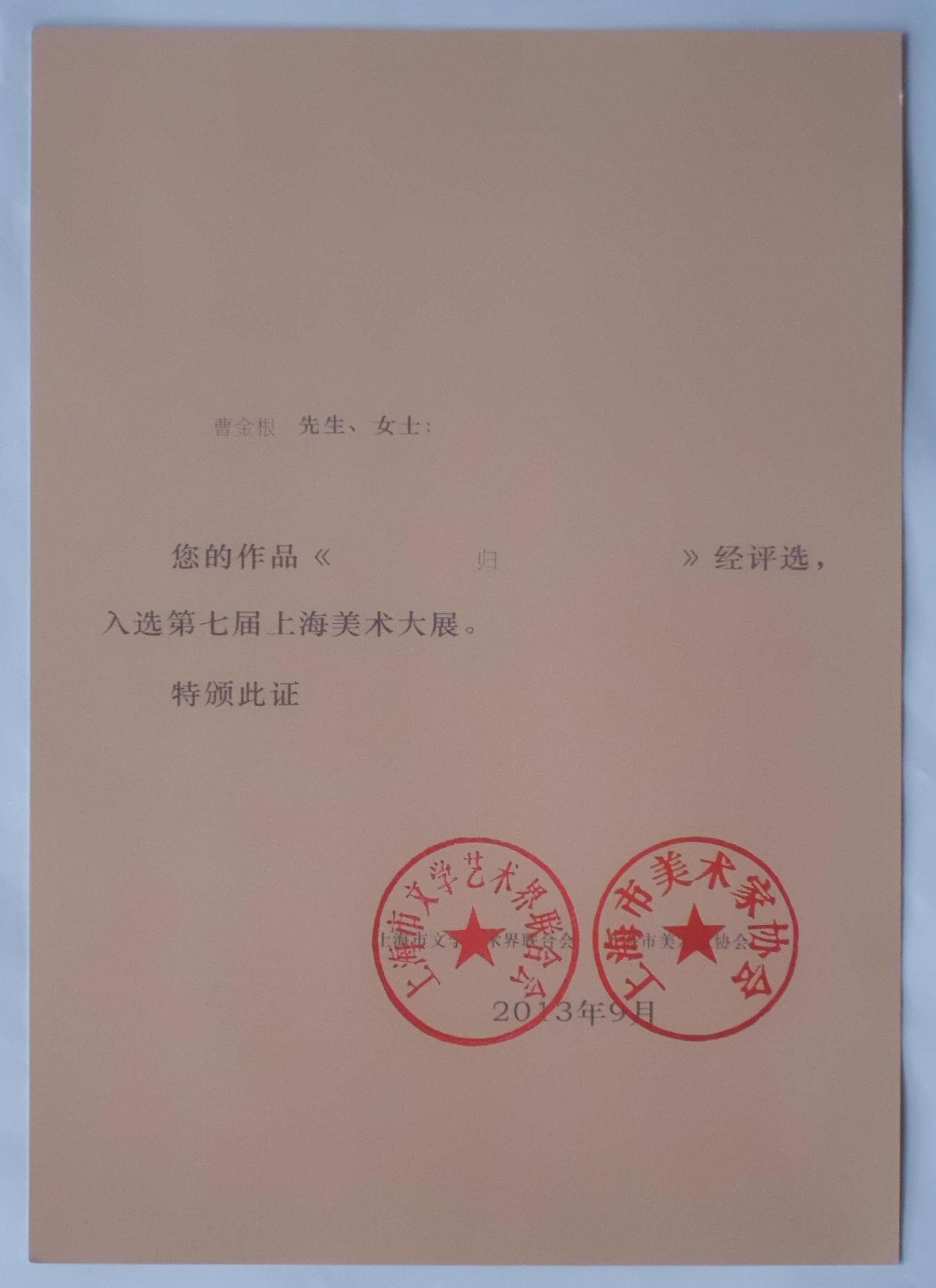 28 сентября 2013 года работа «Возвращение» была выбрана в качестве Шанхайской федерации литературных и художественных кругов и спонсируется Ассоциацией Шанхайских художников.&Ldquo; 7 -я Шанхайская выставка изобразительного искусства&Rdquo;