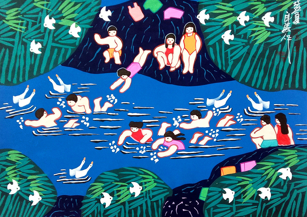 Маленькая летняя река, плавать отели сельская ферма, музыка Лю янао, округ, фермеры, рисующий размер 52x38см ручной работы