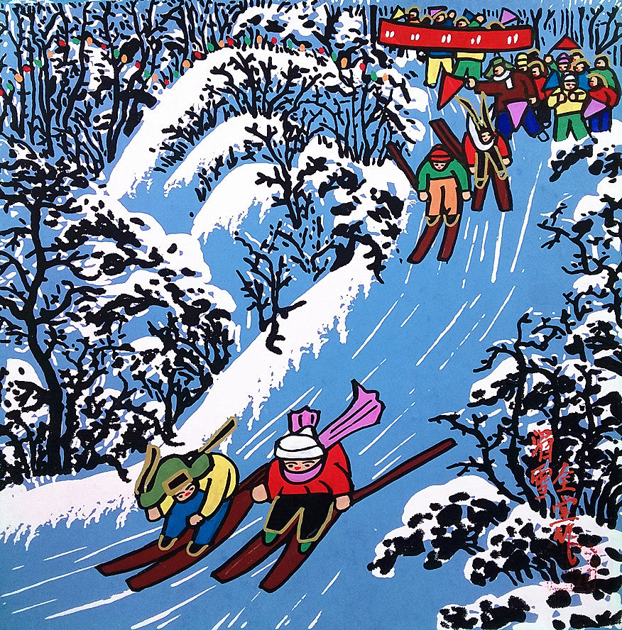Катание на лыжах, играющих на спортивные соревнования зимние северо -восточные пейзажи снежные фермерские живопись, размер 25x25 см.