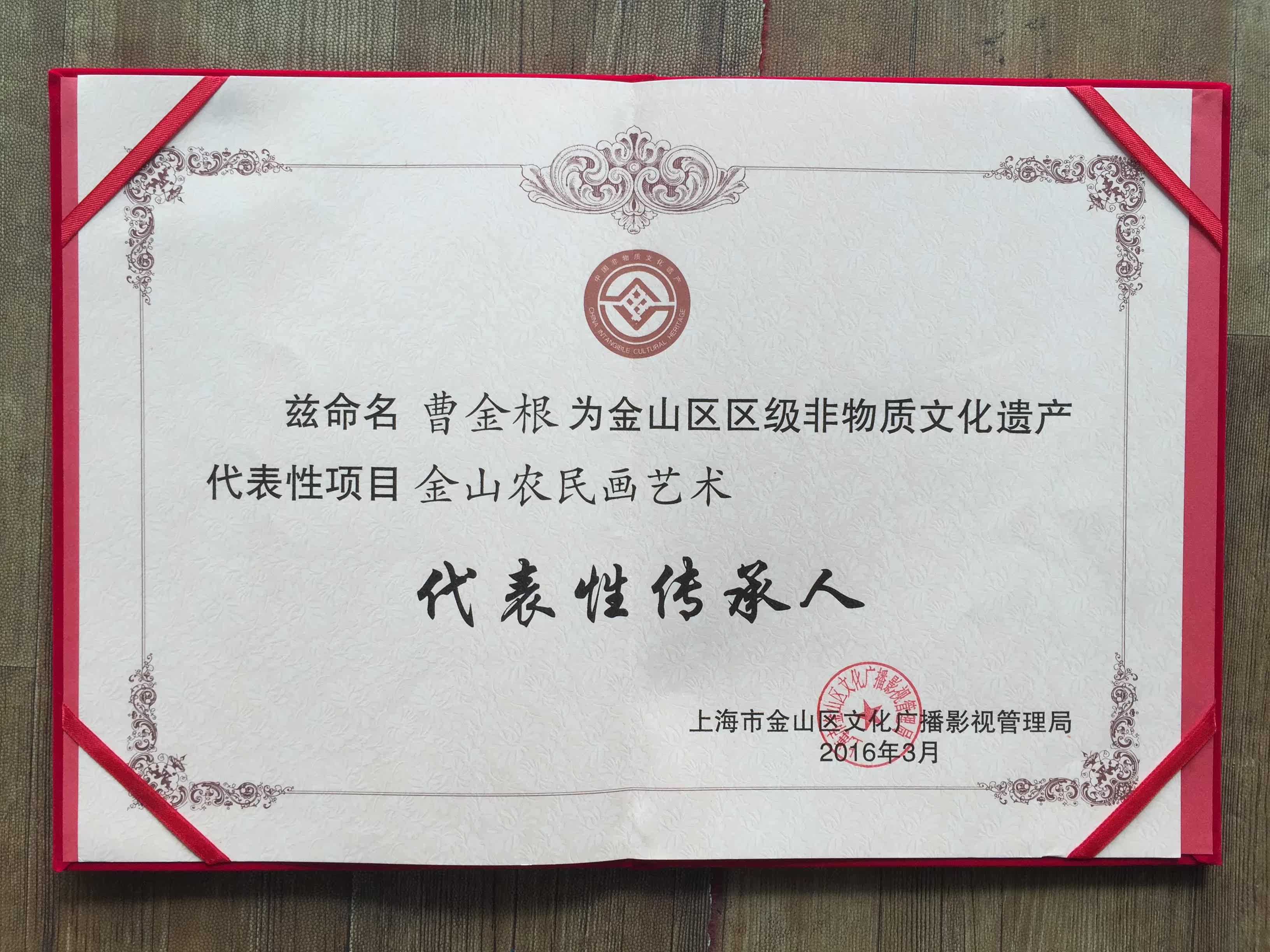 Правительство муниципального народа в Шанхае объявило о «кандидатах на выборы фермеров Джиншан, живопись искусством в Шанхайском нематериальном культурном наследии», а также было выпущено управление культурным трансляцией в Шанхае.