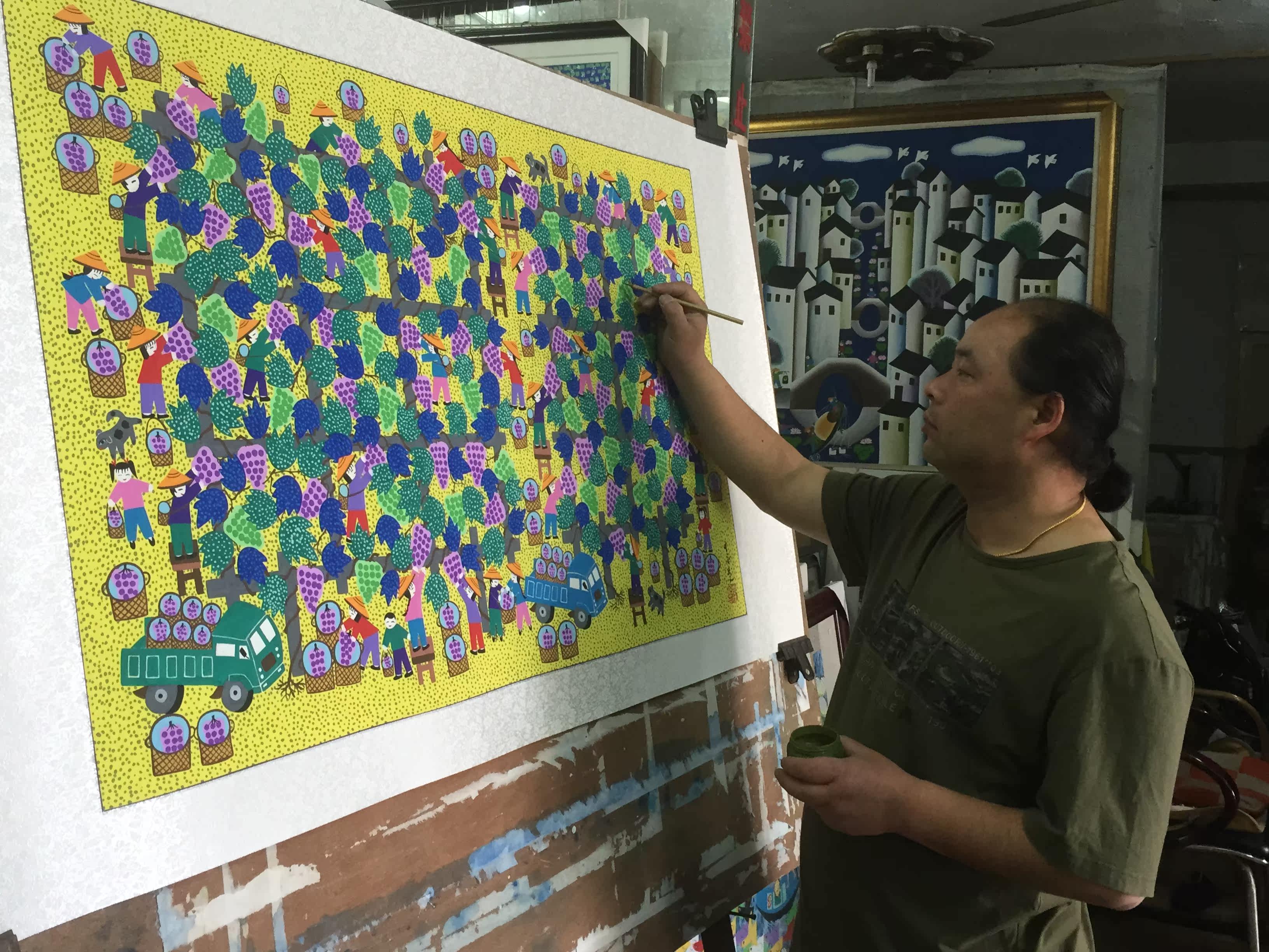 В конце августа 2003 года он рисует фреску «сотню чертежи» и фрески печи для города Шанхай Фенгью.