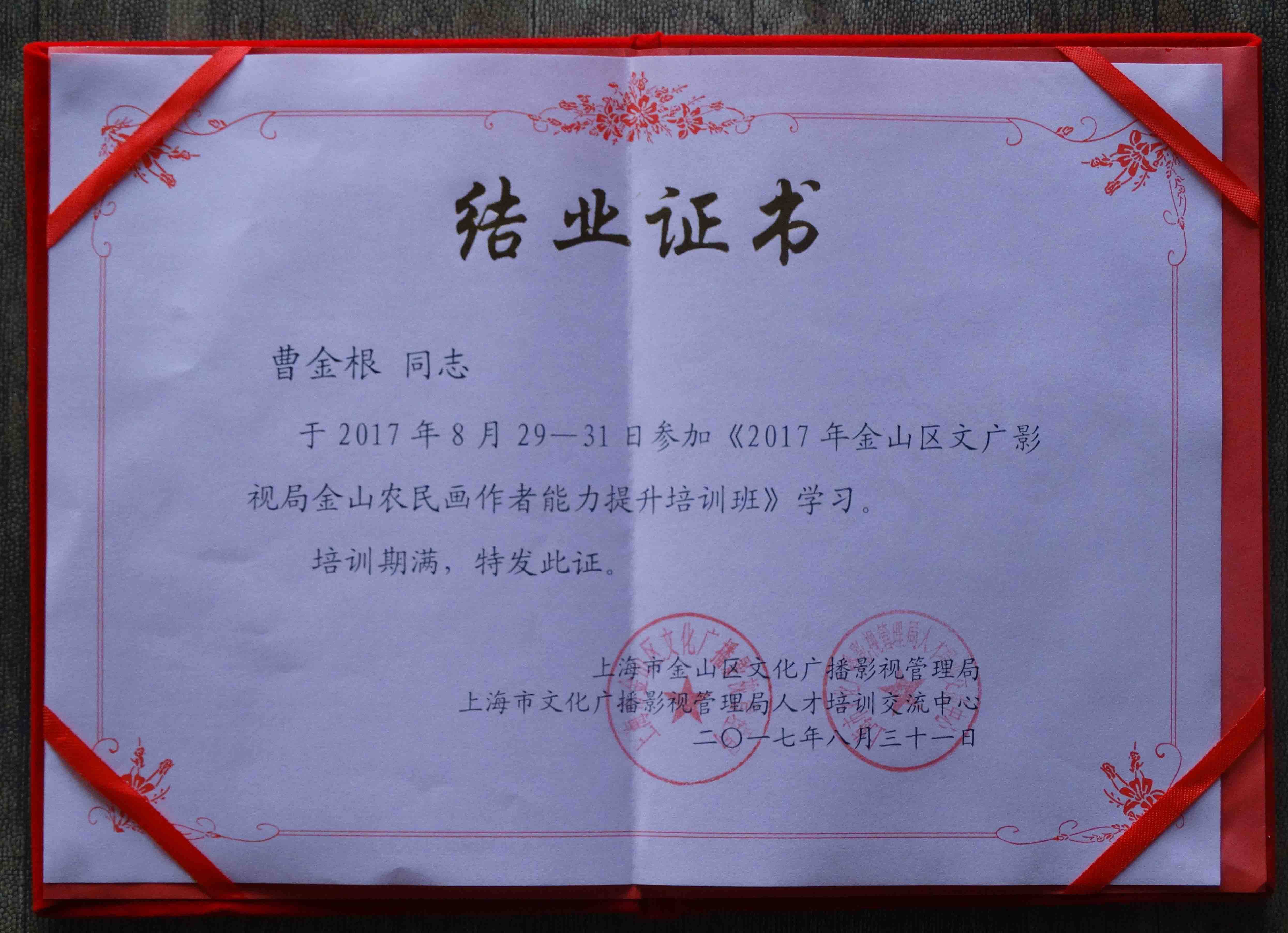 29-31 августа 2017 г. Цао Джинсен принял участие в Бюро кино и телевидения в округе Джиншан&Ldquo; Jinshan Farmers's Painting Companies улучшает курс обучения&Rdquo; организован в Центре обучения и обмена талантов Шанхайского управления культурным вещанием и телевидения.