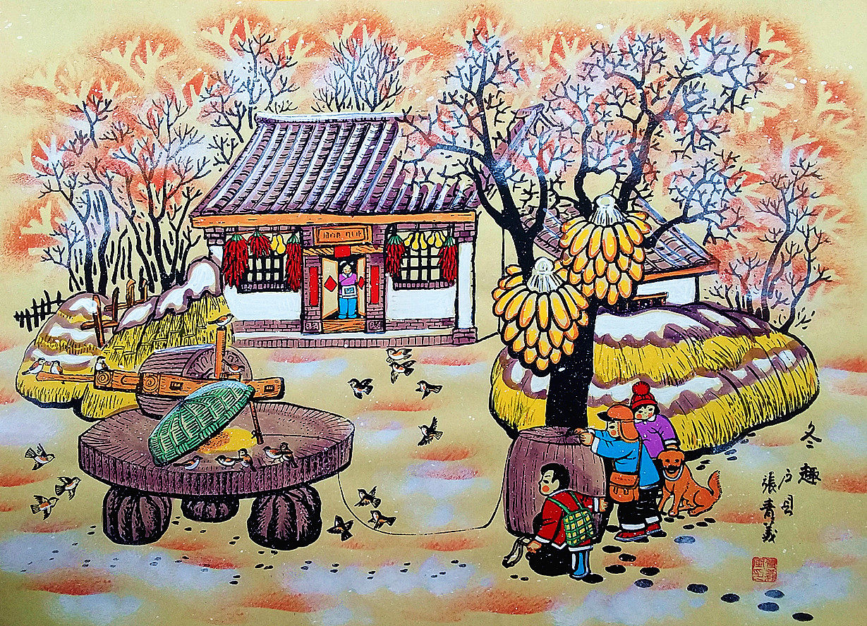 Зимние веселье сельское детское воробей Фармхаус украшения Чжан Циньиху округа Фермеры Размер 52x38 см.