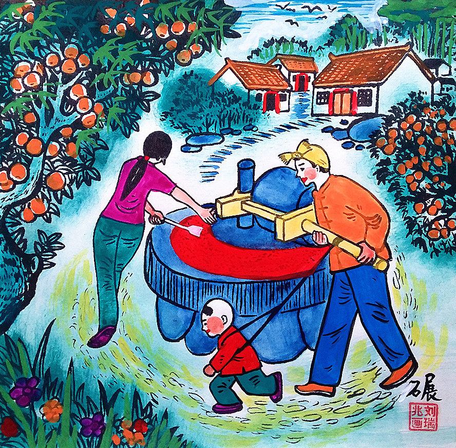 Mulbon Rural Life Village Голова подтолкнула всю семью всей семьи на труд в Шэньси Хусиан Фермеры, живопись размером 25x25 см.