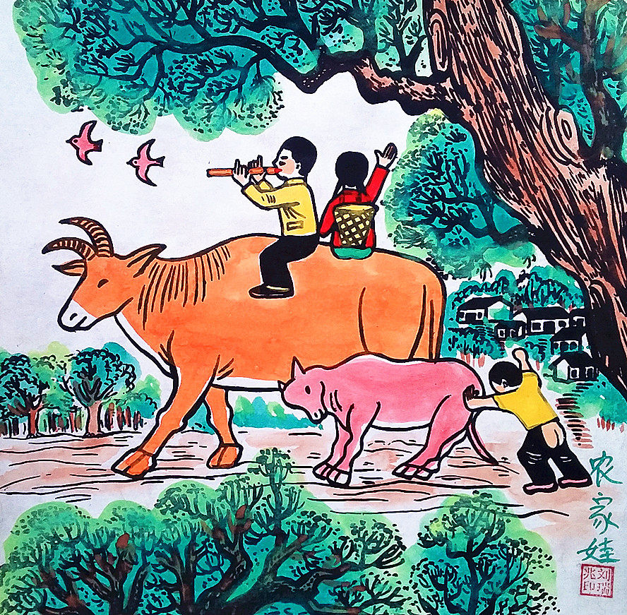 Фермерские пешеходные дети Музи Мюи, едущие в пастырской пастырской песне, песня Xi'an yizhu, размер живописи 25x25см.