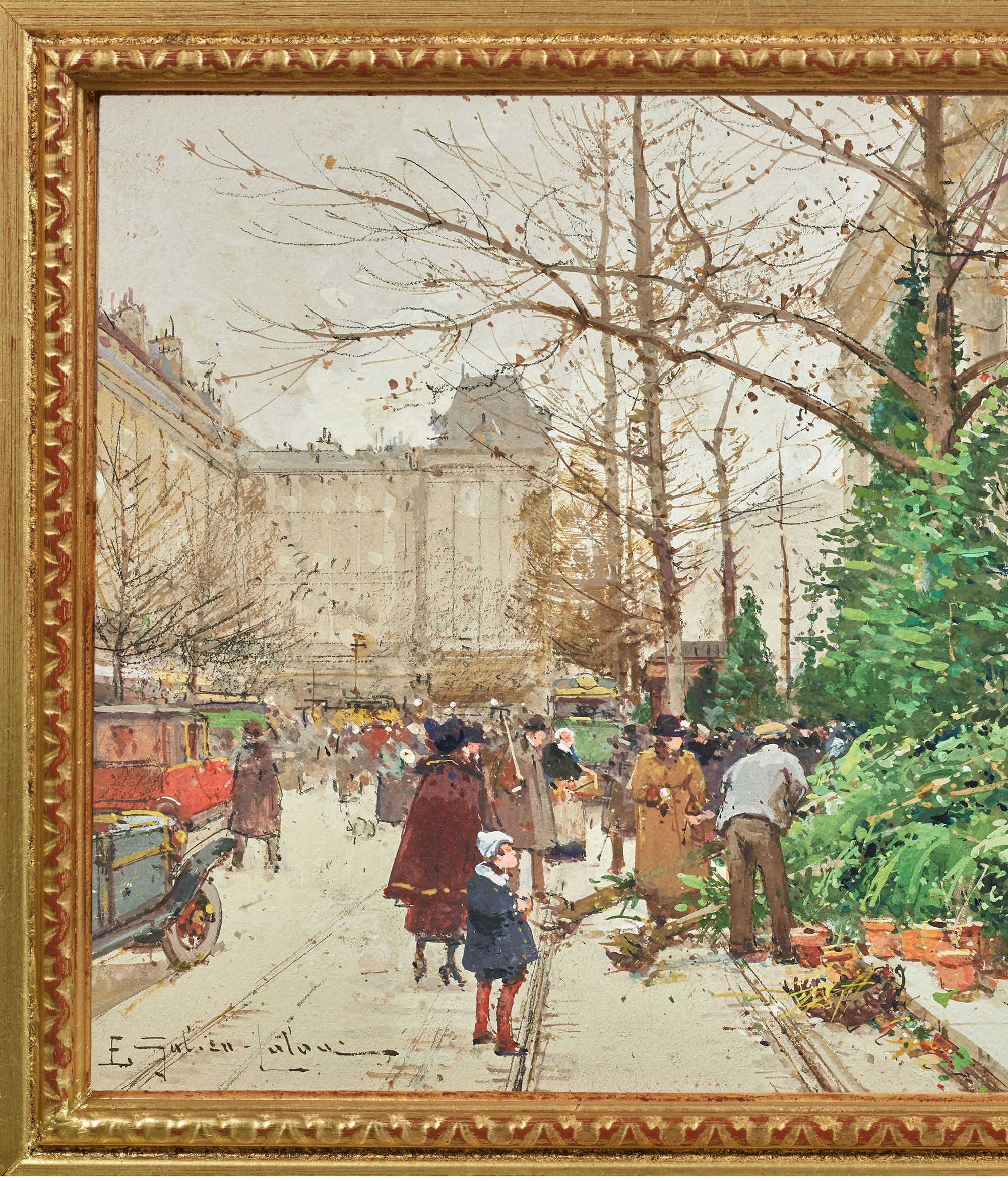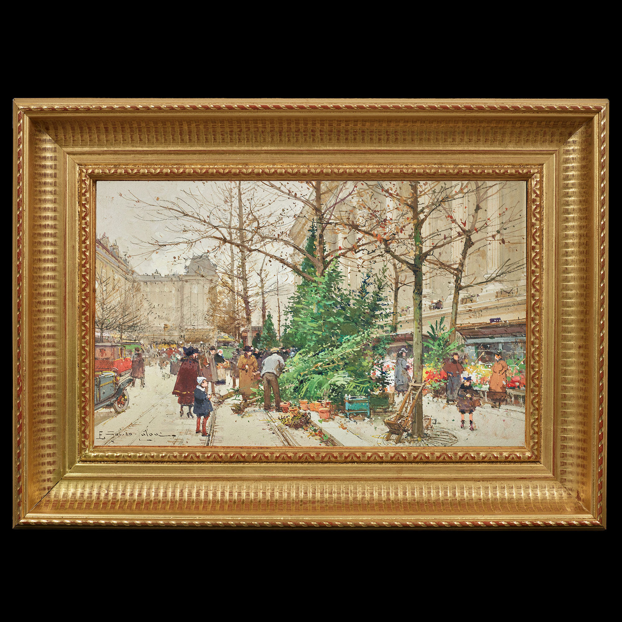 19конец века20Французский художник Евген Джалиан-Лару подписал и создал бумажный гуашь, живопись «Парижский цветочный рынок перед Рождеством»