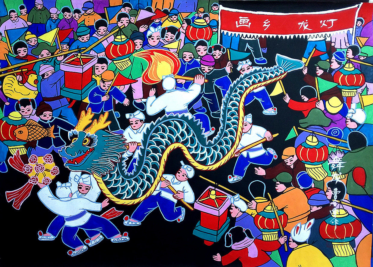 Dragon Dance Spring Festival Festival New Yeve Fork Celebration празднует фермеров Cao Quantang Farmer Painting Размер 52x38см ручной работы