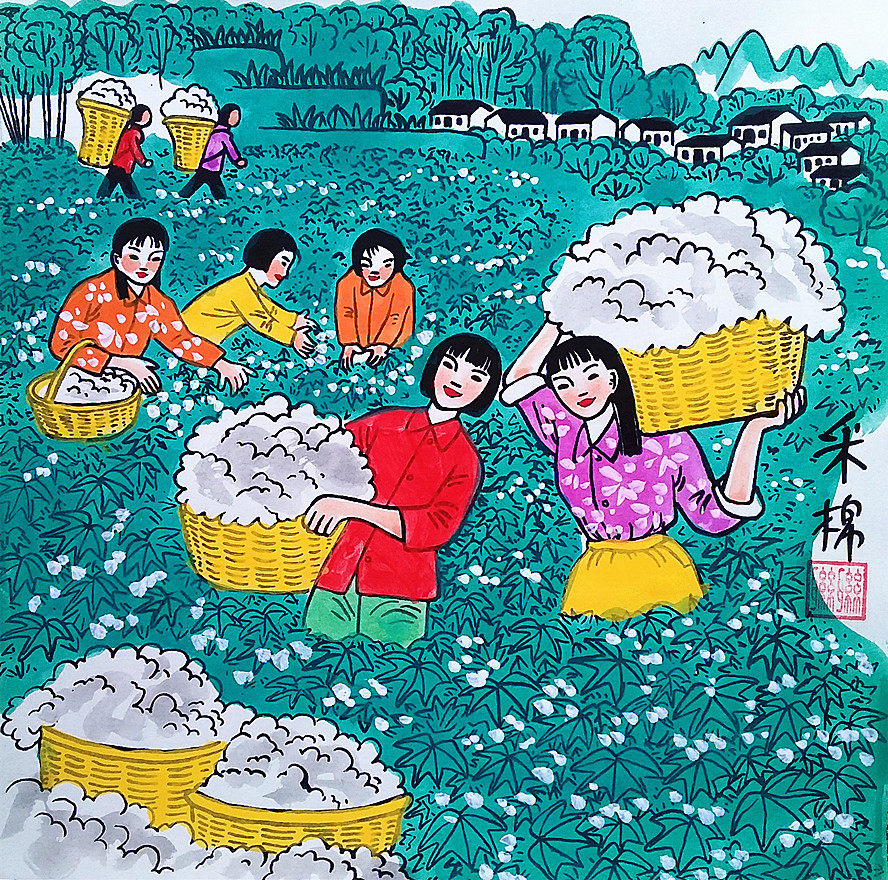 Сельские коллективные труды женщины, выбирающие хлопковое ресторан, декоративная живопись домохозяйственные фермеры, фермеры, картина размером 25x25 см