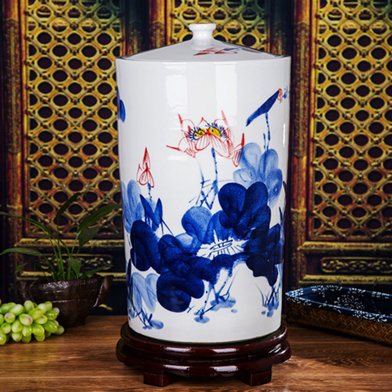Джингджэнь керамический синий и белый ручной рисовый цилиндр рисовый ствол ствол рисовой коробка 35 кот 50 кот с крышкой хранения.